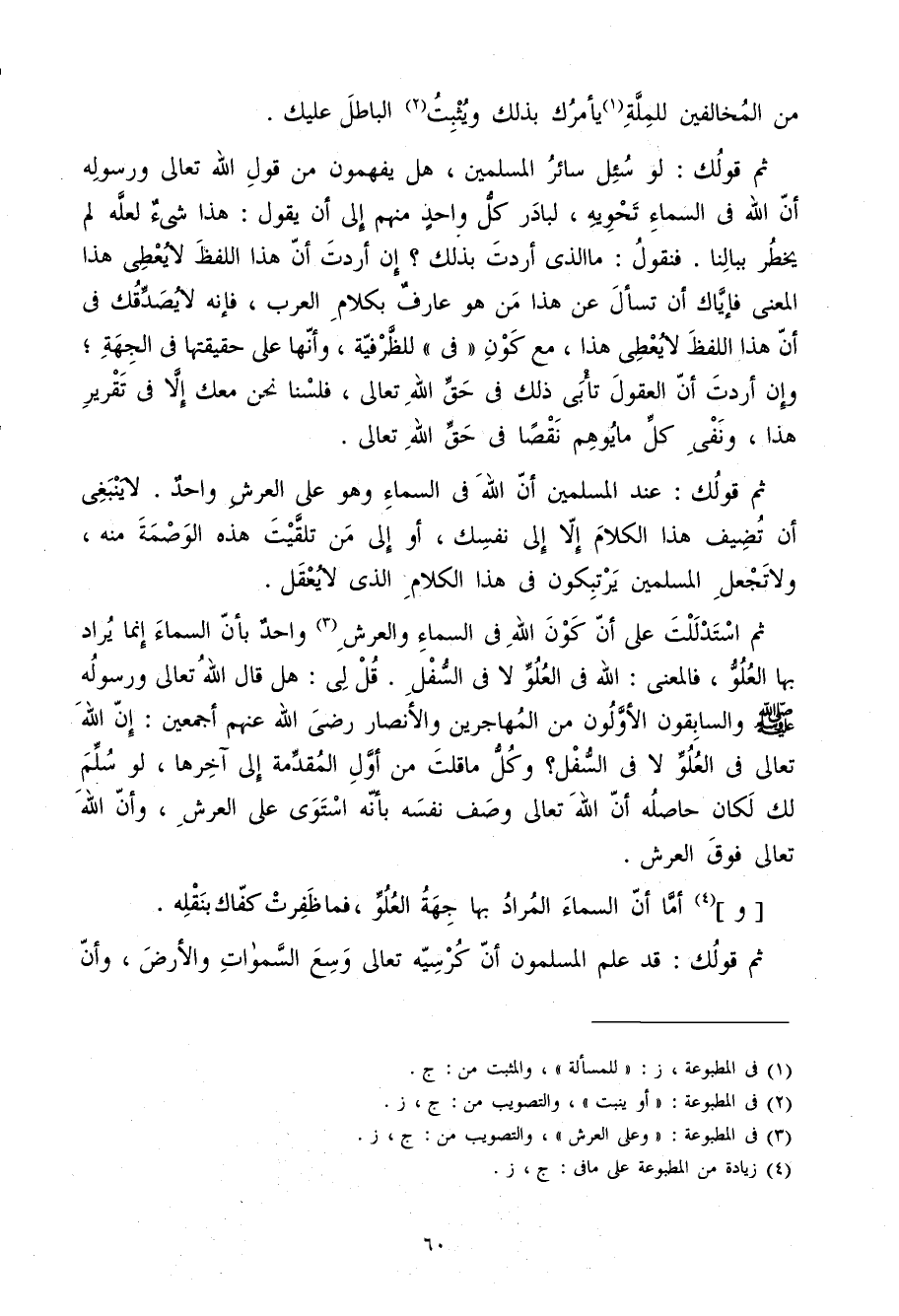 ثمَّ قَوْلك عِنْد الْمُسلمين أَن الله فِي السَّمَاء وَهُوَ على الْعَرْش وَاحِد