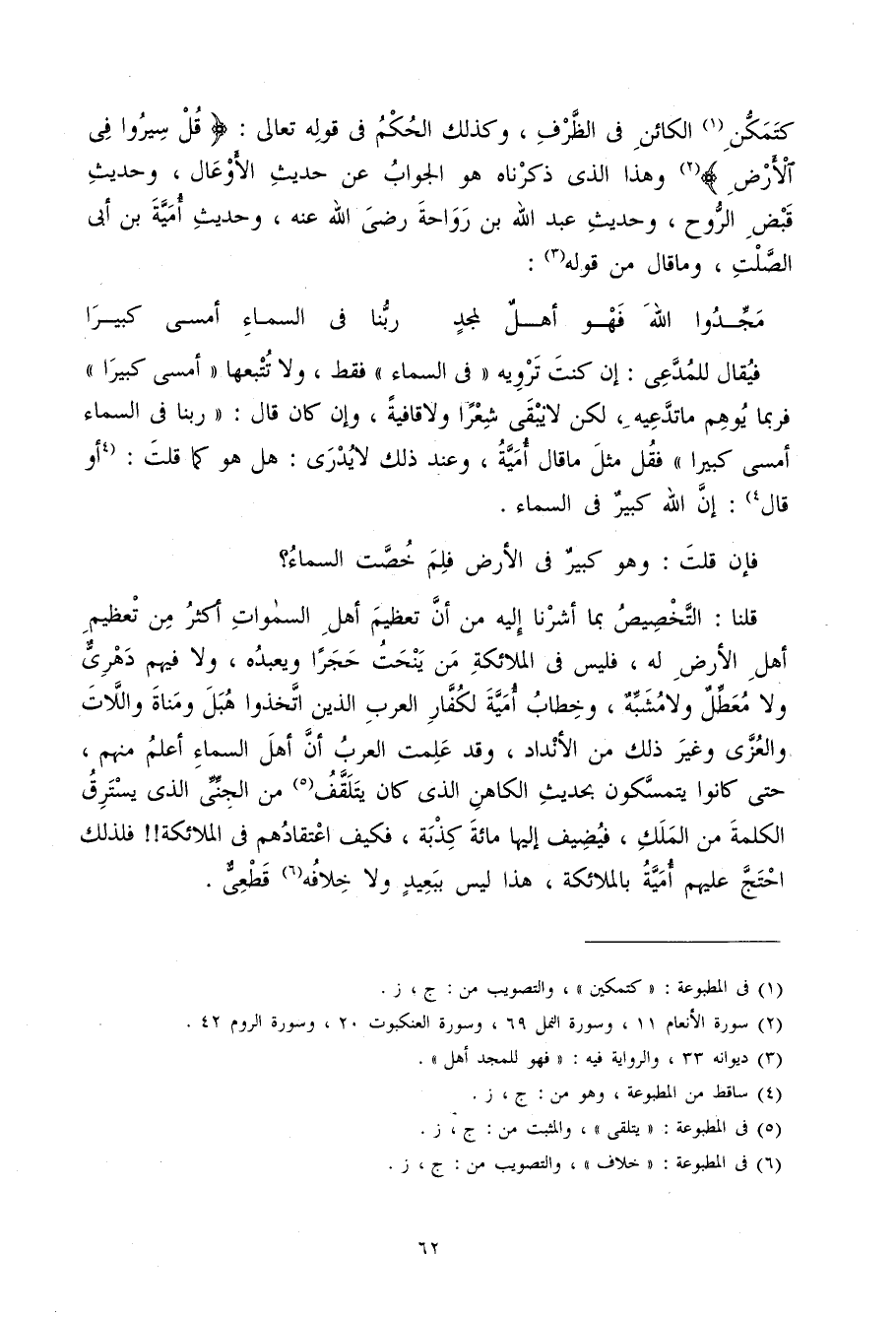 فَيُقَال للْمُدَّعِي إِن كنت ترويه فِي السَّمَاء فَقَط وَلَا تتبعها أَمْسَى كَبِيرا فَرُبمَا يُوهم مَا تدعيه لَكِن لَا يبْقى شعرًا وَلَا قافية وَإِن كَانَ قَالَ رَبنَا فِي السَّمَاء أَمْسَى كَبِيرا فَقل مثل مَا قَالَ أُميَّة وَعند ذَلِك لَا يدرى هَل هُوَ كَمَا قلت أَو قَالَ إِن الله كَبِير فِي السَّمَاء