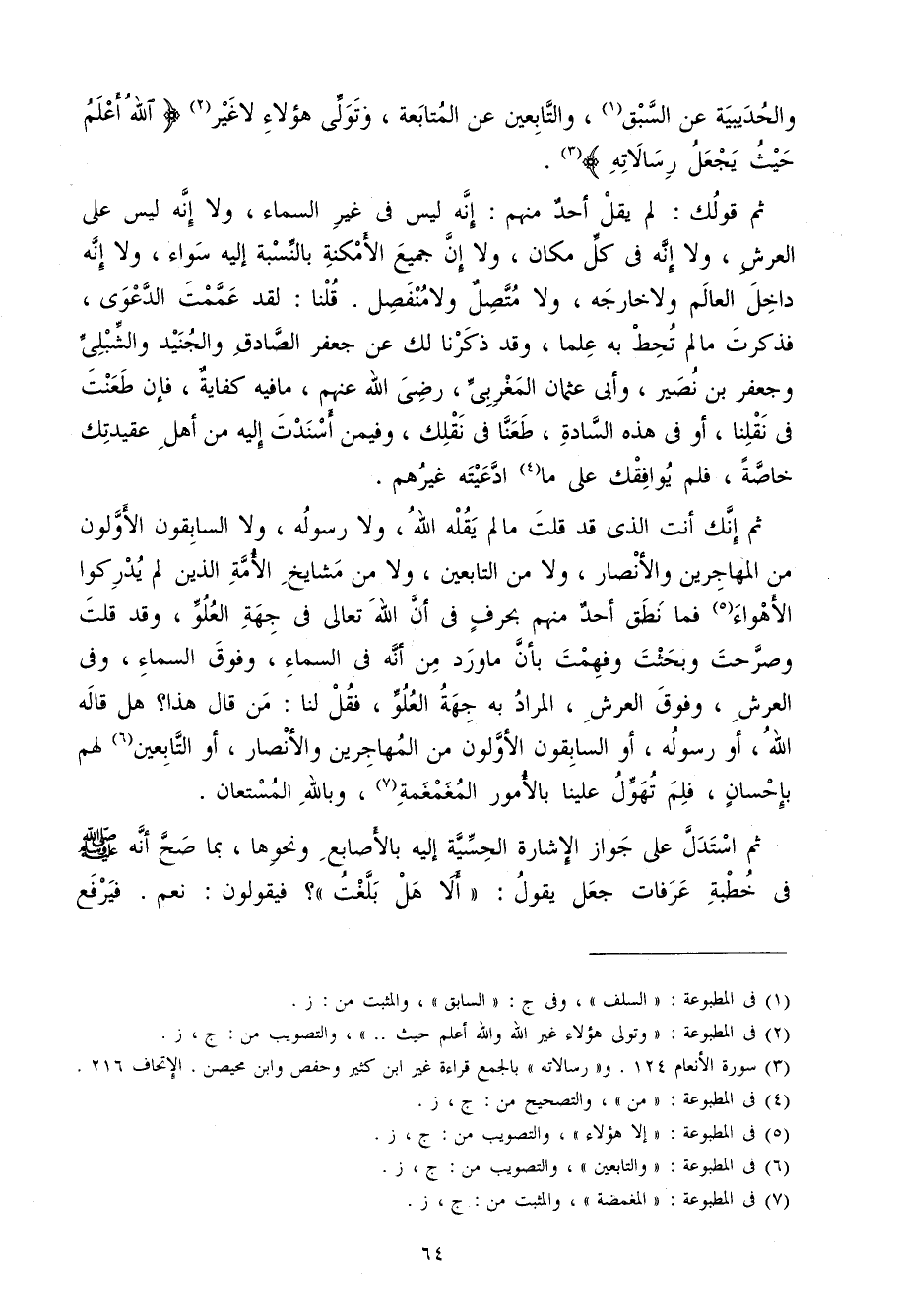 ثمَّ إِنَّك أَنْت الَّذِي قد قلت مَا لم يقلهُ الله وَلَا رَسُوله وَلَا السَّابِقُونَ الْأَولونَ من الْمُهَاجِرين وَالْأَنْصَار وَلَا من التَّابِعين وَلَا من مَشَايِخ الْأمة الَّذين لم يدركوا الْأَهْوَاء فَمَا نطق أحد مِنْهُم بِحرف فِي أَن الله تَعَالَى فِي جِهَة الْعُلُوّ وَقد قلت وصرحت وبحثت وفهمت بِأَن مَا ورد من أَنه فِي السَّمَاء وَفَوق السَّمَاء وَفِي الْعَرْش وَفَوق الْعَرْش المُرَاد بِهِ جِهَة الْعُلُوّ فَقل لنا من قَالَ هَذَا هَل قَالَه الله أَو رَسُوله أَو السَّابِقُونَ الْأَولونَ من الْمُهَاجِرين وَالْأَنْصَار أَو التَّابِعين لَهُم بِإِحْسَان فَلم تهول علينا بالأمور المغمغمة وَبِاللَّهِ الْمُسْتَعَان