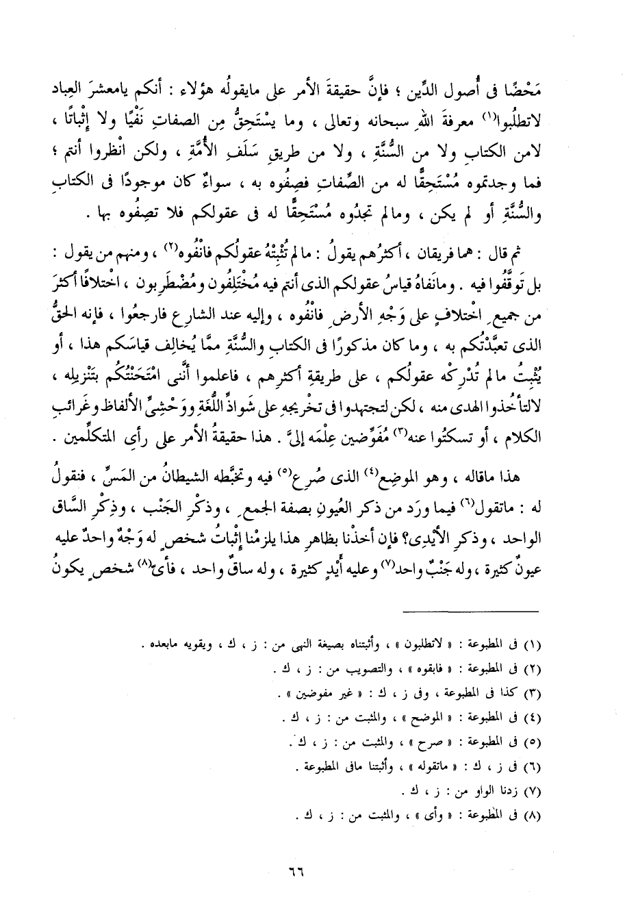 مَحْضا فِي أصُول الدّين فَإِن حَقِيقَة الْأَمر على مَا يَقُوله هَؤُلَاءِ أَنكُمْ يَا معشر الْعباد لَا تَطْلُبُوا معرفَة الله سُبْحَانَهُ وَتَعَالَى وَمَا يسْتَحق من الصِّفَات نفيا وَلَا إِثْبَاتًا لَا من الْكتاب وَلَا من السّنة وَلَا من طَرِيق سلف الْأمة وَلَكِن انْظُرُوا أَنْتُم فَمَا وجدتموه مُسْتَحقّا لَهُ من الصِّفَات فصفوه بِهِ سَوَاء كَانَ مَوْجُودا فِي الْكتاب وَالسّنة أَو لم يكن وَمَا لم تَجِدُوهُ مُسْتَحقّا لَهُ فِي عقولكم فَلَا تصفوه بهَا