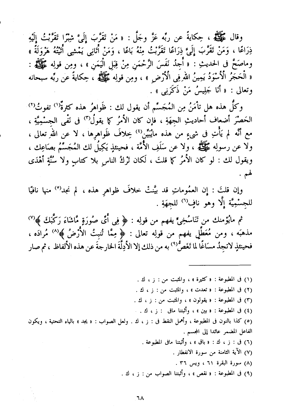 وَقَالَ صلى الله عَلَيْهِ وَسلم حِكَايَة عَن ربه عز وَجل (من تقرب إِلَيّ شبْرًا تقربت إِلَيْهِ ذِرَاعا وَمن تقرب إِلَيّ ذِرَاعا تقربت مِنْهُ باعا وَمن أَتَانِي يمشي أَتَيْته هرولة) وَمَا صَحَّ فِي الحَدِيث (أجد نفس الرَّحْمَن من قبل الْيمن) وَمن قَوْله صلى الله عَلَيْهِ وَسلم (الْحجر الْأسود يَمِين الله فِي الأَرْض) وَمن قَوْله صلى الله عَلَيْهِ وَسلم حِكَايَة عَن ربه سُبْحَانَهُ وَتَعَالَى (أَنا جليس من ذَكرنِي)