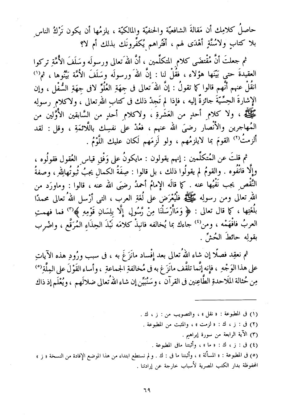 ثمَّ جعلت أَن مُقْتَضى كَلَام الْمُتَكَلِّمين أَن الله تَعَالَى وَرَسُوله وَسلف الْأمة تركُوا العقيدة حَتَّى بَينهَا هَؤُلَاءِ فَقل لنا إِن الله وَرَسُوله وَسلف الْأمة بينوها ثمَّ انقل عَنْهُم أَنهم قَالُوا كَمَا تَقول إِن الله تَعَالَى فِي جِهَة الْعُلُوّ لَا فِي جِهَة السّفل وَإِن الْإِشَارَة الحسية جَائِزَة إِلَيْهِ فَإِذا لم تَجِد ذَلِك فِي كتاب الله تَعَالَى وَلَا كَلَام رَسُوله صلى الله عَلَيْهِ وَسلم وَلَا كَلَام أحد من الْعشْرَة وَلَا كَلَام أحد من السَّابِقين الْأَوَّلين من الْمُهَاجِرين وَالْأَنْصَار رَضِي الله عَنْهُم فعد على نَفسك باللائمة وَقل لقد ألزمت الْقَوْم بِمَا لَا يلْزمهُم وَلَو لَزِمَهُم لَكَانَ عَلَيْك اللوم