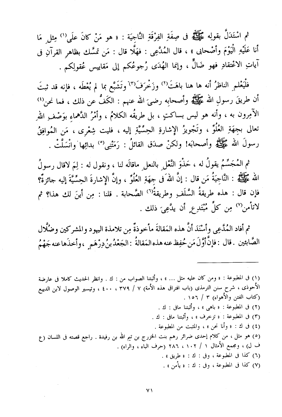 ثمَّ اسْتدلَّ بقوله صلى الله عَلَيْهِ وَسلم فِي صفة الْفرْقَة النَّاجِية (هُوَ من كَانَ على مثل مَا أَنا عَلَيْهِ الْيَوْم وأصحابي) قَالَ الْمُدَّعِي فَهَلا قَالَ من تمسك بِظَاهِر الْقُرْآن فِي آيَات الِاعْتِقَاد فَهُوَ ضال وَإِنَّمَا الْهدى رجوعكم إِلَى مقاييس عقولكم