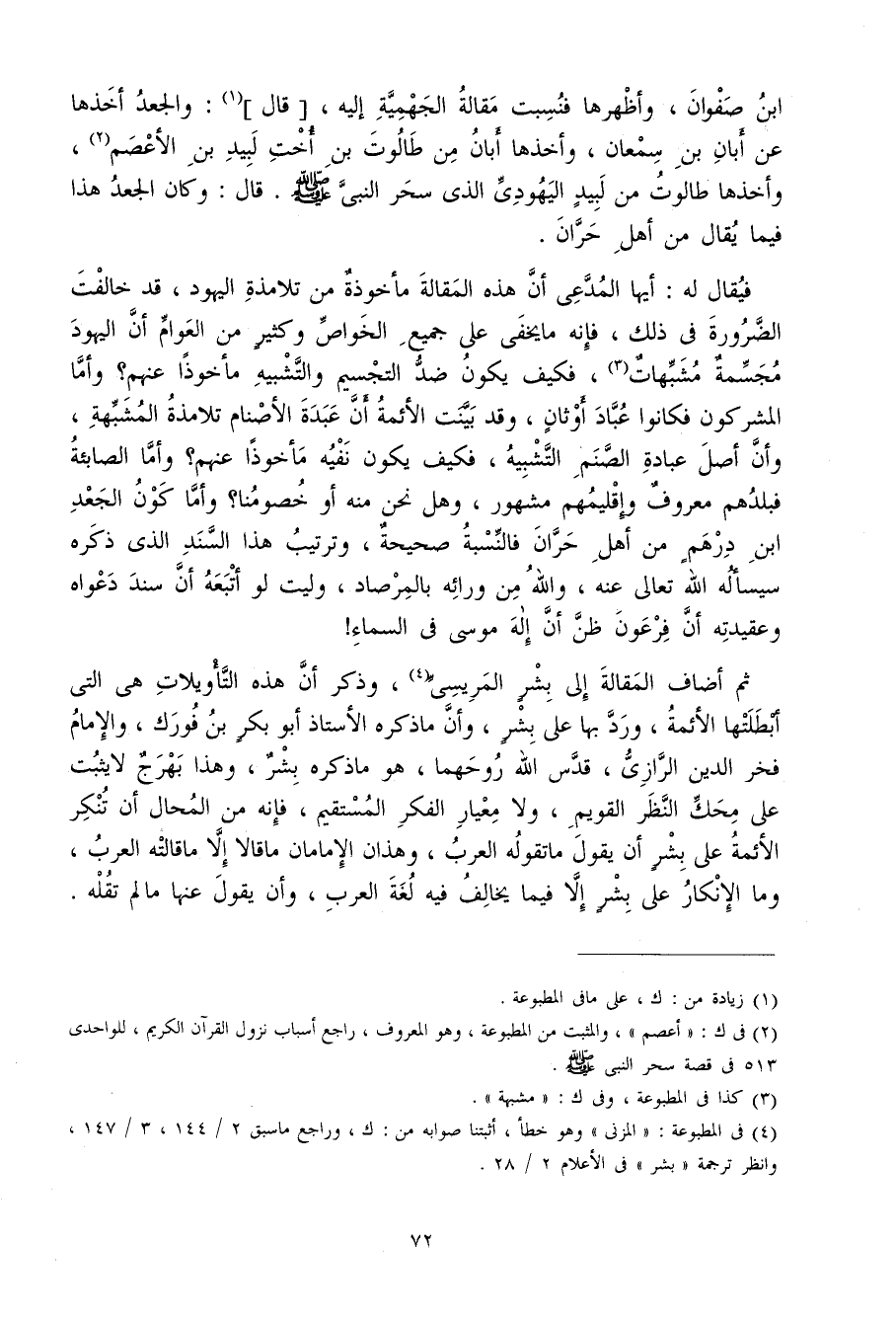 فَيُقَال لَهُ أَيهَا الْمُدَّعِي أَن هَذِه الْمقَالة مَأْخُوذَة من تلامذة الْيَهُود قد خَالَفت الضَّرُورَة فِي ذَلِك فَإِنَّهُ مَا يخفى على جَمِيع الْخَواص وَكثير من الْعَوام أَن الْيَهُود مجسمة مشبهات فَكيف يكون ضد التجسيم والتشبيه مأخوذا عَنْهُم وَأما الْمُشْركُونَ فَكَانُوا عباد أوثان وَقد بيّنت الْأَئِمَّة أَن عَبدة الْأَصْنَام تلامذة المشبهة وَأَن أصل عبَادَة الصَّنَم التَّشْبِيه فَكيف يكون نَفْيه مأخوذا عَنْهُم وَأما الصابئة فبلدهم مَعْرُوف وإقليمهم مَشْهُور وَهل نَحن مِنْهُ أَو خصومنا وَأما كَون الْجَعْد ابْن دِرْهَم من أهل حران فالنسبة صَحِيحَة وترتيب هَذَا السَّنَد الَّذِي ذكره سيسأله الله تَعَالَى عَنهُ وَالله من وَرَائه بالمرصاد وليت لَو أتبعه أَن سَنَد دَعْوَاهُ وعقيدته أَن فِرْعَوْن ظن أَن إِلَه مُوسَى فِي السَّمَاء