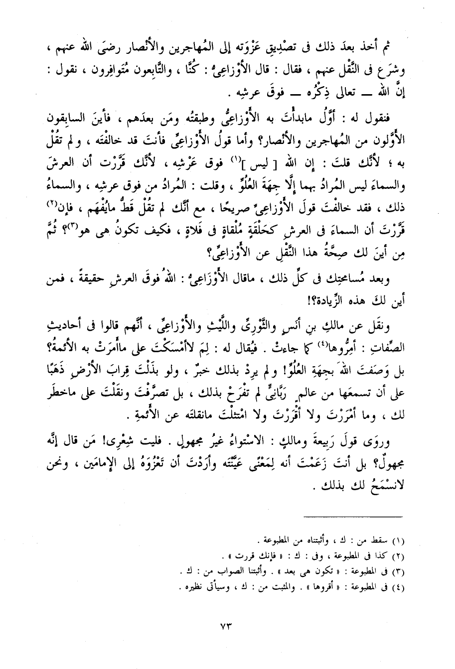 ثمَّ أَخذ بعد ذَلِك فِي تَصْدِيق عزوته إِلَى الْمُهَاجِرين وَالْأَنْصَار رَضِي الله عَنْهُم وَشرع فِي النَّقْل عَنْهُم فَقَالَ قَالَ الْأَوْزَاعِيّ كُنَّا والتابعون متوافرون نقُول إِن الله تَعَالَى ذكره فَوق عَرْشه