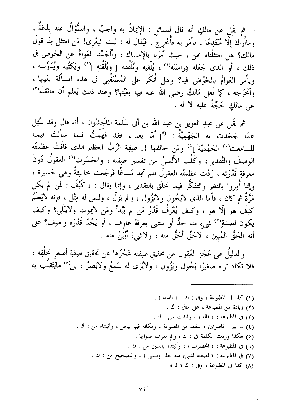 ثمَّ نقل عَن عبد الْعَزِيز بن عبد الله بن أبي سَلمَة الْمَاجشون أَنه قَالَ وَقد سُئِلَ عَمَّا جحدت بِهِ الْجَهْمِية أما بعد فقد فهمت فِيمَا سَأَلت فِيمَا للسامعت الْجَهْمِية وَمن خالفها فِي صفة الرب الْعَظِيم الَّذِي فاقت عَظمته الْوَصْف وَالتَّقْدِير وكلت الألسن عَن تَفْسِير صفته وانحسرت الْعُقُول دون معرفَة قدرته ردَّتْ عَظمته الْعُقُول فَلم تَجِد مساغا فَرَجَعت خاسئة وَهِي حسيرة وَإِنَّمَا أمروا بِالنّظرِ والتفكر فِيمَا خلق بالتقدير وَإِنَّمَا يُقَال كَيفَ لمن لم يكن مرّة ثمَّ كَانَ فَأَما الَّذِي لَا يحول وَلَا يَزُول وَلم يزل وَلَيْسَ لَهُ مثل فَإِنَّهُ لَا يعلم كَيفَ هُوَ إِلَّا هُوَ وَكَيف يعرف قدر من لم يبْدَأ وَمن لَا يَمُوت وَلَا يبْلى وَكَيف يكون لصفة شَيْء مِنْهُ حد أَو مُنْتَهى يعرفهُ عَارِف أَو يحد قدره واصف على أَنه الْحق الْمُبين لَا حق أَحَق مِنْهُ وَلَا شَيْء أبين مِنْهُ