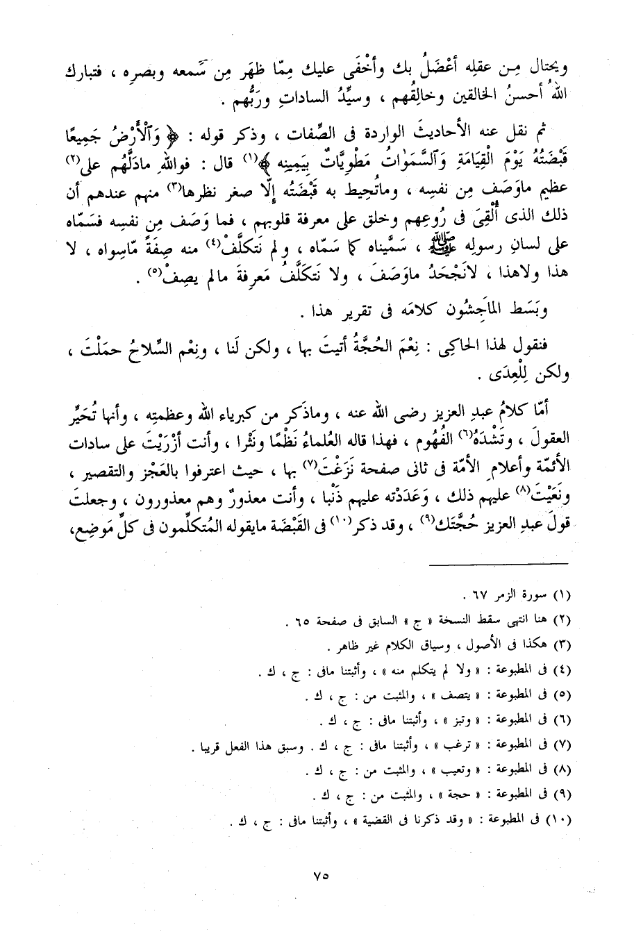 أما كَلَام عبد الْعَزِيز رَضِي الله عَنهُ وَمَا ذكر من كبرياء الله وعظمته وَأَنَّهَا تحير الْعُقُول وتشده الفهوم فَهَذَا قَالَه الْعلمَاء نظما ونثرا وَأَنت أزريت على سَادَات الْأَئِمَّة وأعلام الْأمة فِي ثَانِي صفحة نزغت بهَا حَيْثُ اعْتَرَفُوا بِالْعَجزِ وَالتَّقْصِير ونعيت عَلَيْهِم ذَلِك وعددته عَلَيْهِم ذَنبا وَأَنت مَعْذُور وهم معذورون وَجعلت قَول عبد الْعَزِيز حجتك وَقد ذكر فِي القبضة مَا يَقُوله المتكلمون فِي كل مَوضِع