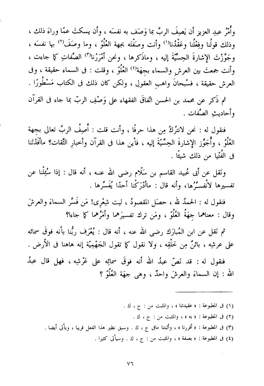ثمَّ ذكر عَن مُحَمَّد بن الْحسن اتِّفَاق الْفُقَهَاء على وصف الرب مَا جَاءَ فِي الْقُرْآن وَأَحَادِيث الصِّفَات
