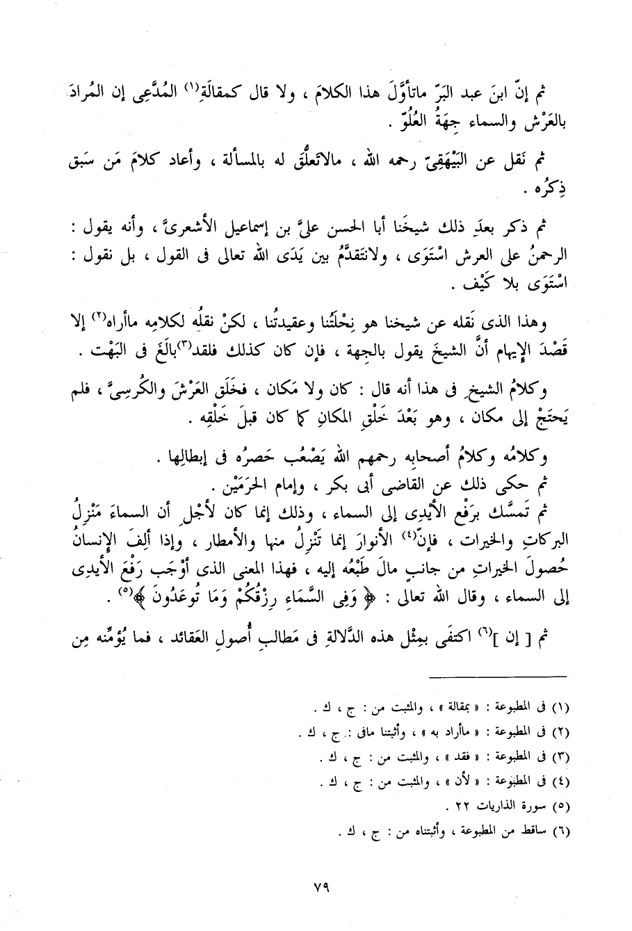 ثمَّ إِن ابْن عبد الْبر مَا تَأَول هَذَا الْكَلَام وَلَا قَالَ كمقالة الْمُدَّعِي إِن المُرَاد بالعرش وَالسَّمَاء جِهَة الْعُلُوّ