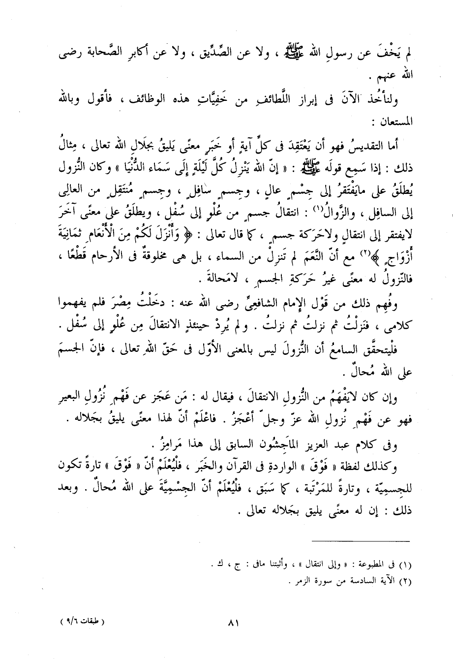 أما التَّقْدِيس فَهُوَ أَن يعْتَقد فِي كل آيَة أَو خبر معنى يَلِيق بِجلَال الله تَعَالَى مِثَال ذَلِك إِذا سمع قَوْله صلى الله عَلَيْهِ وَسلم (إِن الله ينزل كل لَيْلَة إِلَى سَمَاء الدُّنْيَا) وَكَانَ النُّزُول يُطلق على مَا يفْتَقر إِلَى جسم عَال وجسم سافل وجسم منتقل من العالي إِلَى السافل والزوال انْتِقَال جسم من علو إِلَى سفل وَيُطلق على معنى آخر لَا يفْتَقر إِلَى انْتِقَال وَلَا حَرَكَة جسم كَمَا قَالَ تَعَالَى {وَأنزل لكم من الْأَنْعَام ثَمَانِيَة أَزوَاج} مَعَ أَن النعم لم تنزل من السَّمَاء بل هِيَ مخلوقة فِي الْأَرْحَام قطعا فالنزول لَهُ معنى غير حَرَكَة الْجِسْم لَا محَالة