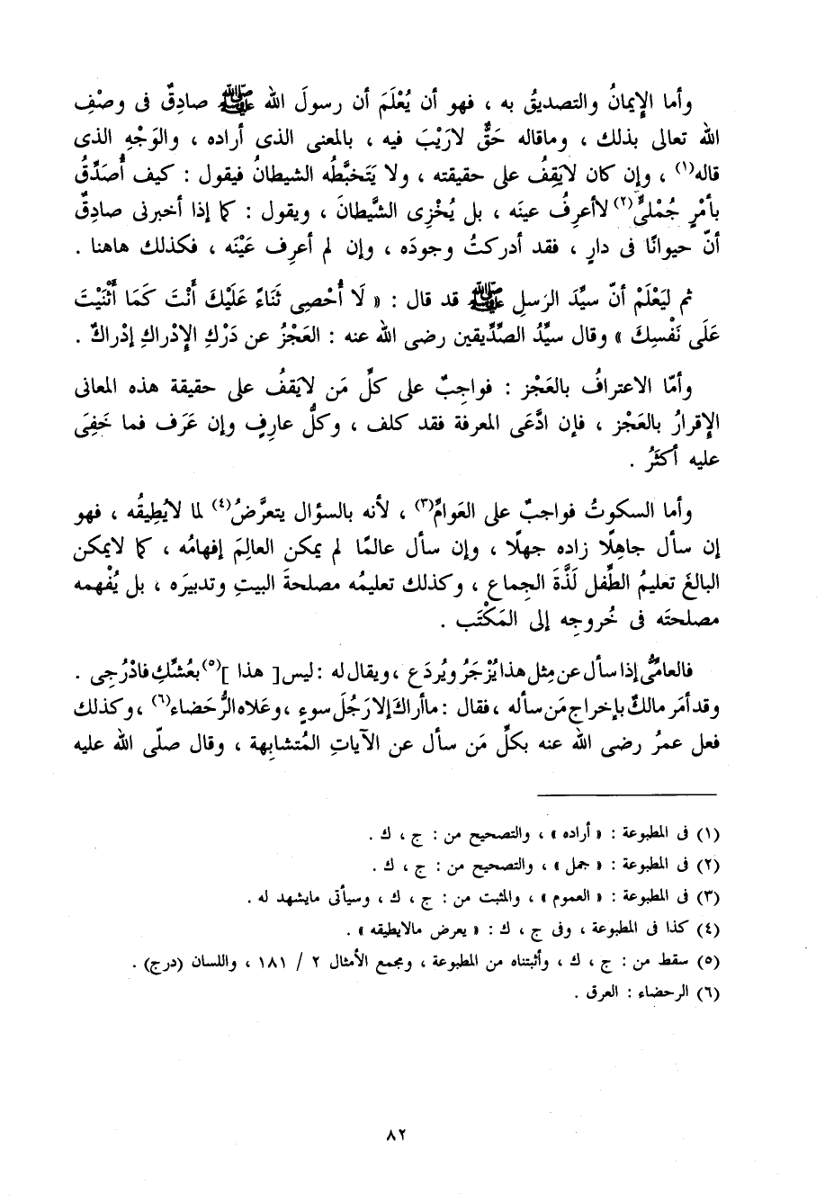 ثمَّ ليعلم أَن سيد الرُّسُل صلى الله عَلَيْهِ وَسلم قد قَالَ (لَا أحصي ثَنَاء عَلَيْك أَنْت كَمَا أثنيت على نَفسك) وَقَالَ سيد الصديقين رَضِي الله عَنهُ الْعَجز عَن دَرك الْإِدْرَاك إِدْرَاك