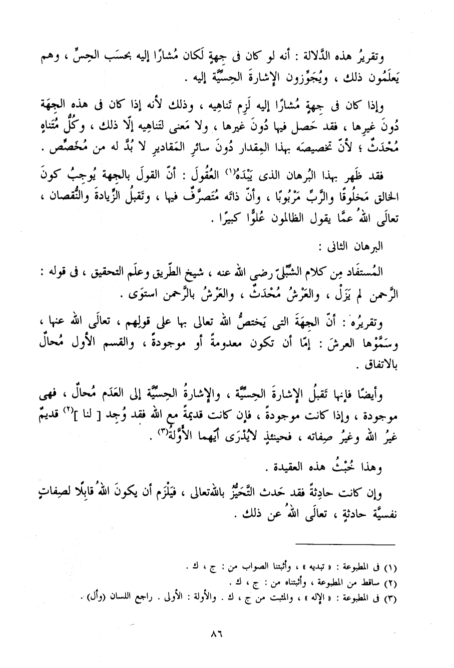 فقد ظهر بِهَذَا الْبُرْهَان الَّذِي يُبْدِهِ الْعُقُول أَن القَوْل بالجهة يُوجب كَون الْخَالِق مخلوقا والرب مربوبا وَأَن ذَاته متصرف فِيهَا وَتقبل الزِّيَادَة وَالنُّقْصَان تَعَالَى الله عَمَّا يَقُول الظَّالِمُونَ علوا كَبِيرا