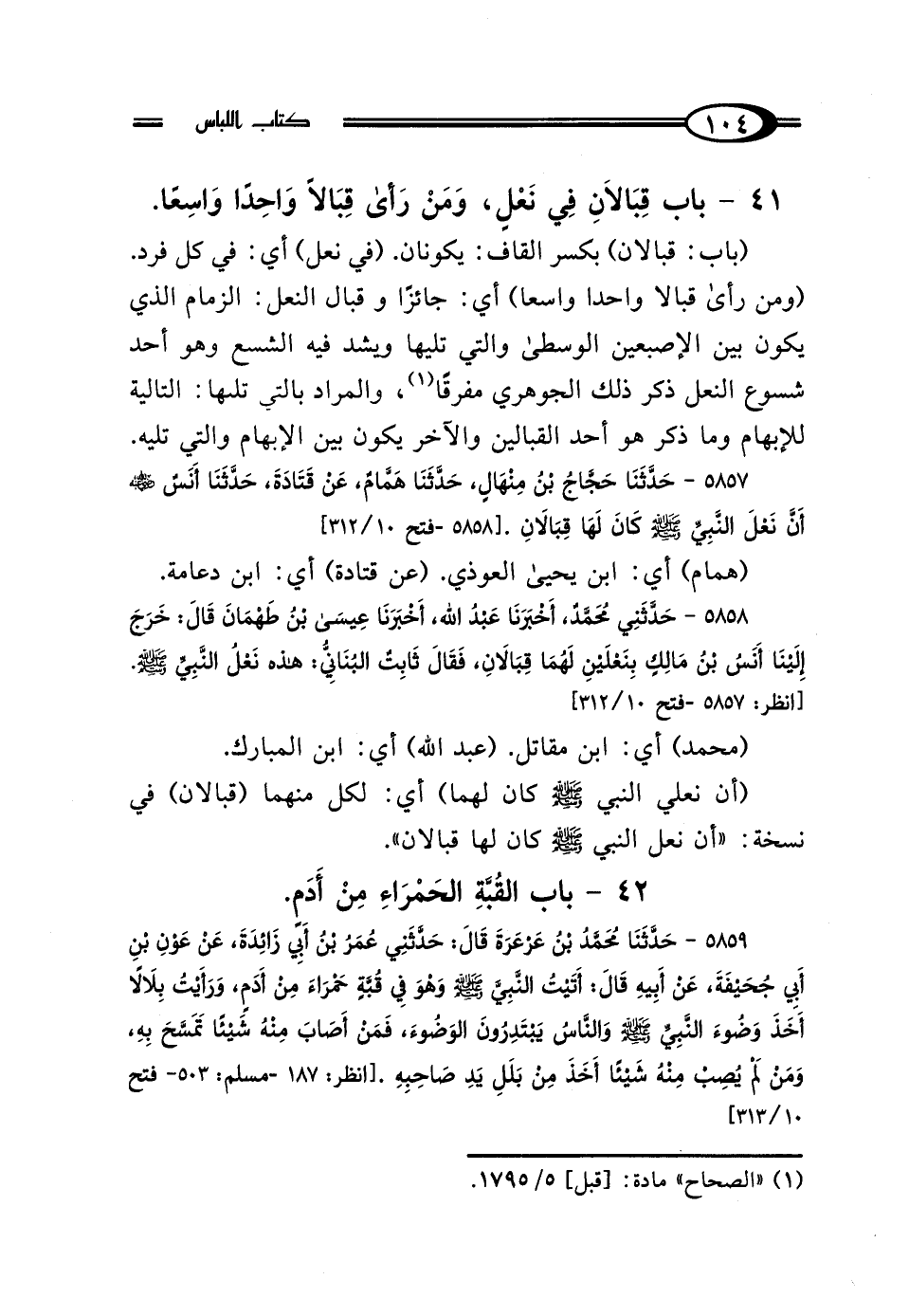 5857 - حَدَّثَنَا حَجَّاجُ بْنُ مِنْهَالٍ، حَدَّثَنَا هَمَّامٌ، عَنْ قَتَادَةَ، حَدَّثَنَا أَنَسٌ رَضِيَ اللَّهُ عَنْهُ: "أَنَّ نَعْلَ النَّبِيِّ صَلَّى اللهُ عَلَيْهِ وَسَلَّمَ كَانَ لَهَا قِبَالانِ".