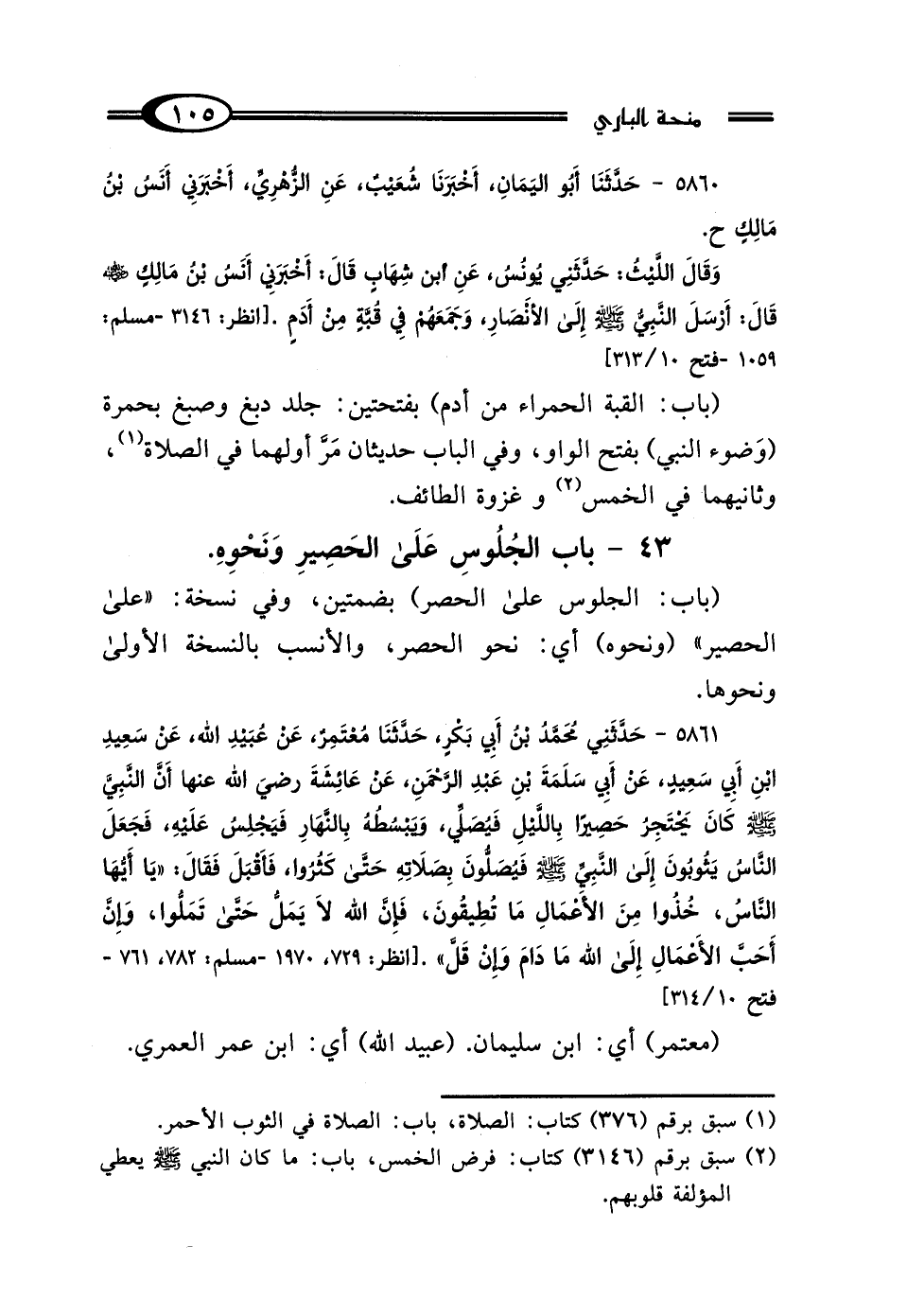 5861 - حَدَّثَنِي مُحَمَّدُ بْنُ أَبِي بَكْرٍ، حَدَّثَنَا مُعْتَمِرٌ، عَنْ عُبَيْدِ اللَّهِ، عَنْ سَعِيدِ بْنِ أَبِي سَعِيدٍ، عَنْ أَبِي سَلَمَةَ بْنِ عَبْدِ الرَّحْمَنِ، عَنْ عَائِشَةَ، رَضِيَ اللَّهُ عَنْهَا: أَنَّ النَّبِيَّ صَلَّى اللهُ عَلَيْهِ وَسَلَّمَ كَانَ يَحْتَجِرُ حَصِيرًا بِاللَّيْلِ فَيُصَلِّي عَلَيْهِ، وَيَبْسُطُهُ بِالنَّهَارِ فَيَجْلِسُ عَلَيْهِ، فَجَعَلَ النَّاسُ يَثُوبُونَ إِلَى النَّبِيِّ صَلَّى اللهُ عَلَيْهِ وَسَلَّمَ فَيُصَلُّونَ بِصَلاتِهِ حَتَّى كَثُرُوا، فَأَقْبَلَ فَقَال: "يَا أَيُّهَا النَّاسُ، خُذُوا مِنَ الأَعْمَالِ مَا تُطِيقُونَ، فَإِنَّ اللَّهَ لَا يَمَلُّ حَتَّى تَمَلُّوا، وَإِنَّ أَحَبَّ الأَعْمَالِ إِلَى اللَّهِ مَا دَامَ وَإِنْ قَلَّ".