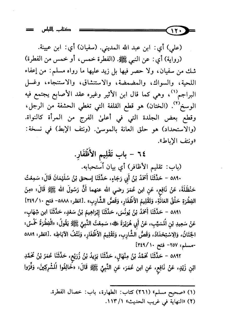 (رواية) أي: عن النبي - صلى اللَّه عليه وسلم -. (الفطرة خمس، أو خمس من الفطرة) شك من سفيان، ولا حصر فيها بل زيد عليها ما رواه مسلم: من إعفاء اللحية، والسواك، والمضمضة، والاستنشاق، والاستنجاء، وغسل البراجم (¬1)، وهي كما قال ابن الأثير وغيره عقد الأصابع يجتمع فيه الوسخ (¬2). (الختان) هو قطع القلفة التي تغطي الحشفة من الرجل، وقطع بعض الجلدة التي في أعلى الفرج من المرأة كالنواة. (والاستحداد) هو حلق العانة بالموسى. (ونتف الإبط) في نسخة: "ونتف الإباط".