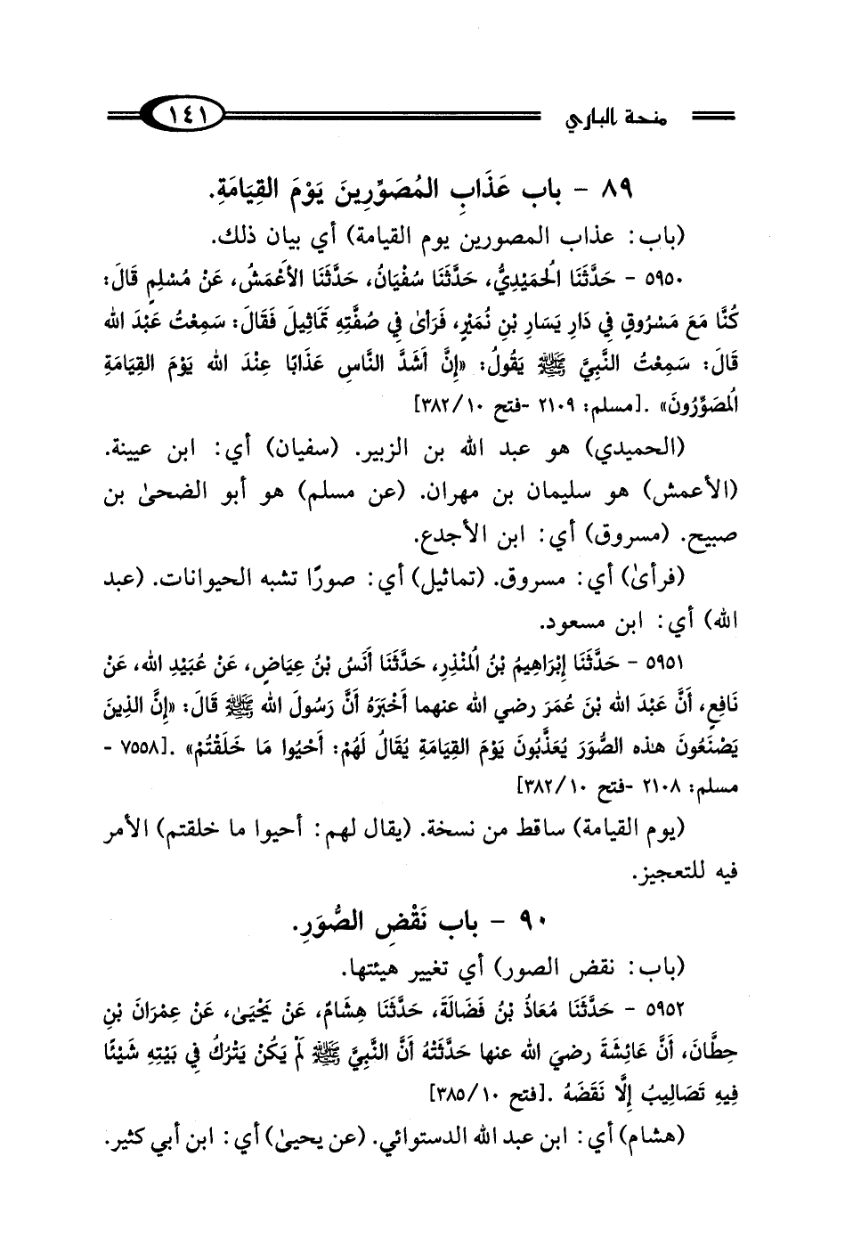 5950 - حَدَّثَنَا الحُمَيْدِيُّ، حَدَّثَنَا سُفْيَانُ، حَدَّثَنَا الأَعْمَشُ، عَنْ مُسْلِمٍ، قَال: كُنَّا مَعَ مَسْرُوقٍ، فِي دَارِ يَسَارِ بْنِ نُمَيْرٍ، فَرَأَى فِي صُفَّتِهِ تَمَاثِيلَ، فَقَال: سَمِعْتُ عَبْدَ اللَّهِ، قَال: سَمِعْتُ النَّبِيَّ صَلَّى اللهُ عَلَيْهِ وَسَلَّمَ يَقُولُ: "إِنَّ أَشَدَّ النَّاسِ عَذَابًا عِنْدَ اللَّهِ يَوْمَ القِيَامَةِ المُصَوِّرُونَ".