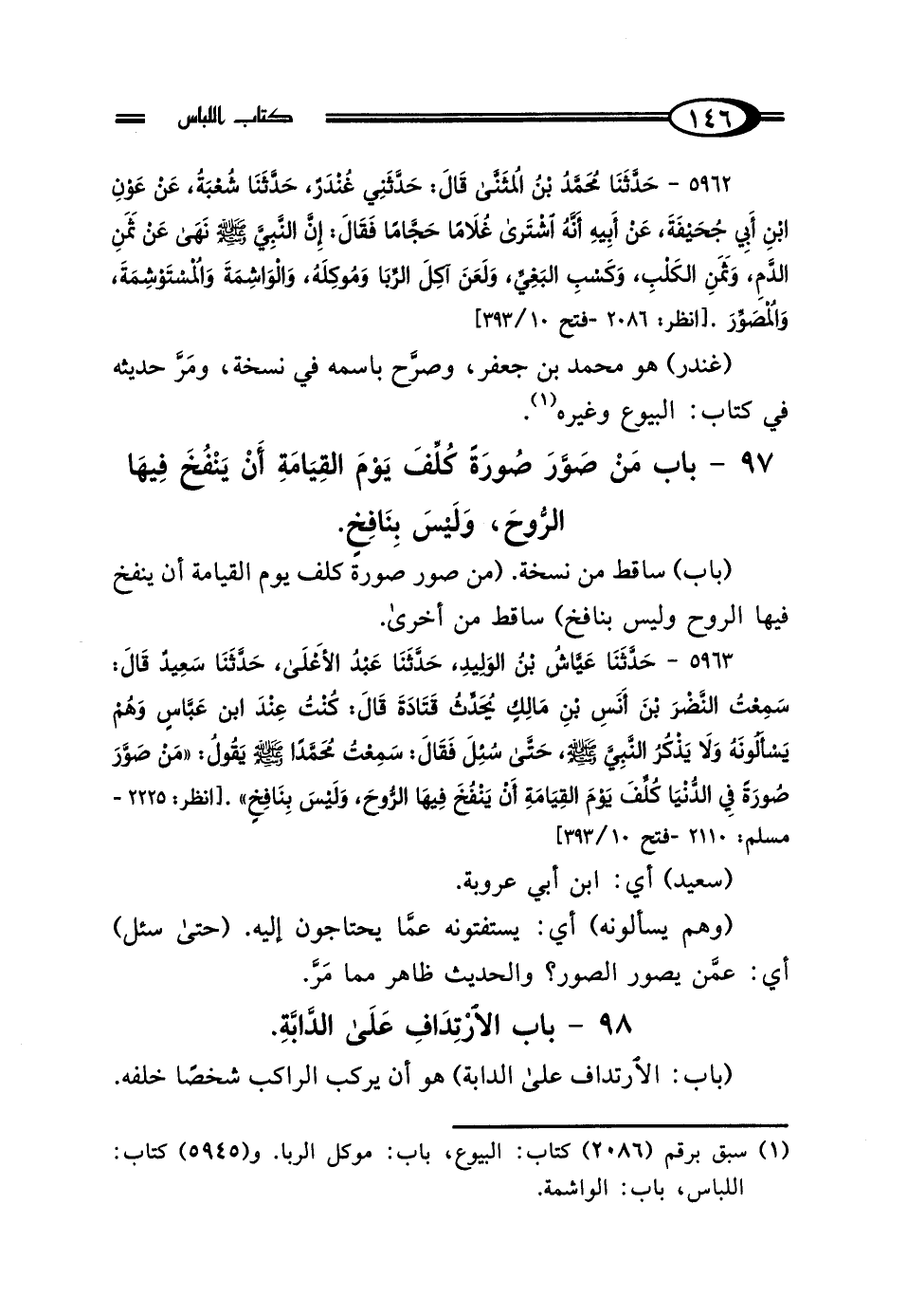 5962 - حَدَّثَنَا مُحَمَّدُ بْنُ المُثَنَّى، قَال: حَدَّثَنِي غُنْدَرٌ، حَدَّثَنَا شُعْبَةُ، عَنْ عَوْنِ بْنِ أَبِي جُحَيْفَةَ، عَنْ أَبِيهِ: أَنَّهُ اشْتَرَى غُلامًا حَجَّامًا، فَقَال: "إِنَّ النَّبِيَّ صَلَّى اللهُ عَلَيْهِ وَسَلَّمَ نَهَى عَنْ ثَمَنِ الدَّمِ، وَثَمَنِ الكَلْبِ، وَكَسْبِ البَغِيِّ، وَلَعَنَ آكِلَ الرِّبَا وَمُوكِلَهُ، وَالوَاشِمَةَ وَالمُسْتَوْشِمَةَ وَالمُصَوِّرَ".