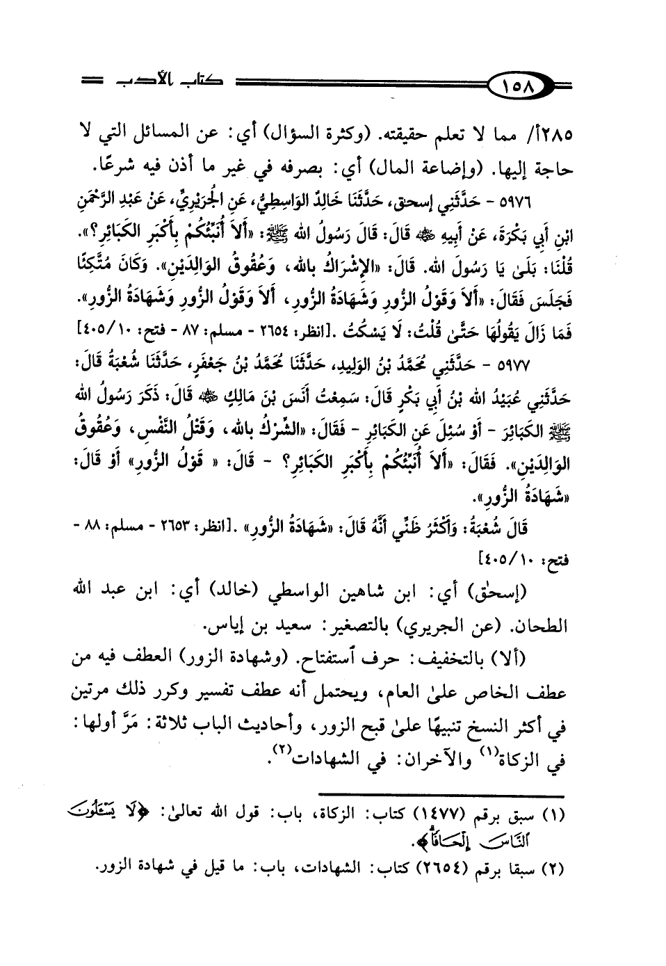 5976 - حَدَّثَنِي إِسْحَاقُ، حَدَّثَنَا خَالِدٌ الوَاسِطِيُّ، عَنِ الجُرَيْرِيِّ، عَنْ عَبْدِ الرَّحْمَنِ بْنِ أَبِي بَكْرَةَ، عَنْ أَبِيهِ رَضِيَ اللَّهُ عَنْهُ قَال: قَال رَسُولُ اللَّهِ صَلَّى اللهُ عَلَيْهِ وَسَلَّمَ: "أَلا أُنَبِّئُكُمْ بِأَكْبَرِ الكَبَائِرِ" قُلْنَا: بَلَى يَا رَسُولَ اللَّهِ، قَال: "الإِشْرَاكُ بِاللَّهِ، وَعُقُوقُ الوَالِدَيْنِ، وَكَانَ مُتَّكِئًا فَجَلَسَ فَقَال: أَلا وَقَوْلُ الزُّورِ، وَشَهَادَةُ الزُّورِ، أَلا وَقَوْلُ الزُّورِ، وَشَهَادَةُ الزُّورِ. فَمَا زَال يَقُولُهَا، حَتَّى قُلْتُ: لَا يَسْكُتُ.