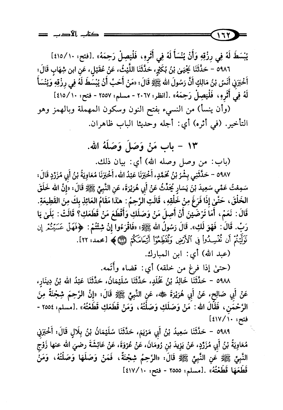 5987 - حَدَّثَنِي بِشْرُ بْنُ مُحَمَّدٍ، أَخْبَرَنَا عَبْدُ اللَّهِ، أَخْبَرَنَا مُعَاويَةُ بْنُ أَبِي مُزَرِّدٍ، قَال: سَمِعْتُ عَمِّي سَعِيدَ بْنَ يَسَارٍ، يُحَدِّثُ، عَنْ أَبِي هُرَيْرَةَ، عَنِ النَّبِيِّ صَلَّى اللهُ عَلَيْهِ وَسَلَّمَ قَال: "إِنَّ اللَّهَ خَلَقَ الخَلْقَ، حَتَّى إِذَا فَرَغَ مِنْ خَلْقِهِ، قَالتِ الرَّحِمُ: هَذَا مَقَامُ العَائِذِ بِكَ مِنَ القَطِيعَةِ، قَال: نَعَمْ، أَمَا تَرْضَيْنَ أَنْ أَصِلَ مَنْ وَصَلَكِ، وَأَقْطَعَ مَنْ قَطَعَكِ؟ قَالتْ: بَلَى يَا رَبِّ، قَال: فَهُوَ لَكِ " قَال رَسُولُ اللَّهِ صَلَّى اللهُ عَلَيْهِ وَسَلَّمَ: "فَاقْرَءُوا إِنْ شِئْتُمْ: {فَهَلْ عَسَيْتُمْ إِنْ تَوَلَّيْتُمْ أَنْ تُفْسِدُوا فِي الأَرْضِ وَتُقَطِّعُوا أَرْحَامَكُمْ} [محمد: 22].
