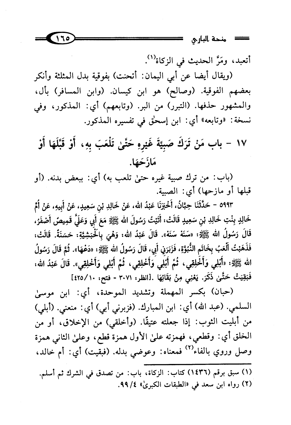 5993 - حَدَّثَنَا حِبَّانُ، أَخْبَرَنَا عَبْدُ اللَّهِ، عَنْ خَالِدِ بْنِ سَعِيدٍ، عَنْ أَبِيهِ، عَنْ أُمِّ خَالِدٍ بِنْتِ خَالِدِ بْنِ سَعِيدٍ، قَالتْ: أَتَيْتُ رَسُولَ اللَّهِ صَلَّى اللهُ عَلَيْهِ وَسَلَّمَ مَعَ أَبِي وَعَلَيَّ قَمِيصٌ أَصْفَرُ، قَال رَسُولُ اللَّهِ صَلَّى اللهُ عَلَيْهِ وَسَلَّمَ: "سَنَهْ سَنَهْ" قَال عَبْدُ اللَّهِ: وَهِيَ بِالحَبَشِيَّةِ: حَسَنَةٌ، قَالتْ: فَذَهَبْتُ أَلْعَبُ بِخَاتَمِ النُّبُوَّةِ فَزَبَرَنِي أَبِي، قَال رَسُولُ اللَّهِ صَلَّى اللهُ عَلَيْهِ وَسَلَّمَ: "دَعْهَا" ثُمَّ قَال رَسُولُ اللَّهِ صَلَّى اللهُ عَلَيْهِ وَسَلَّمَ: "أَبْلِي وَأَخْلِقِي، ثُمَّ أَبْلِي وَأَخْلِقِي، ثُمَّ أَبْلِي وَأَخْلِقِي" قَال عَبْدُ اللَّهِ: فَبَقِيَتْ حَتَّى ذَكَرَ، يَعْنِي مِنْ بَقَائِهَا.