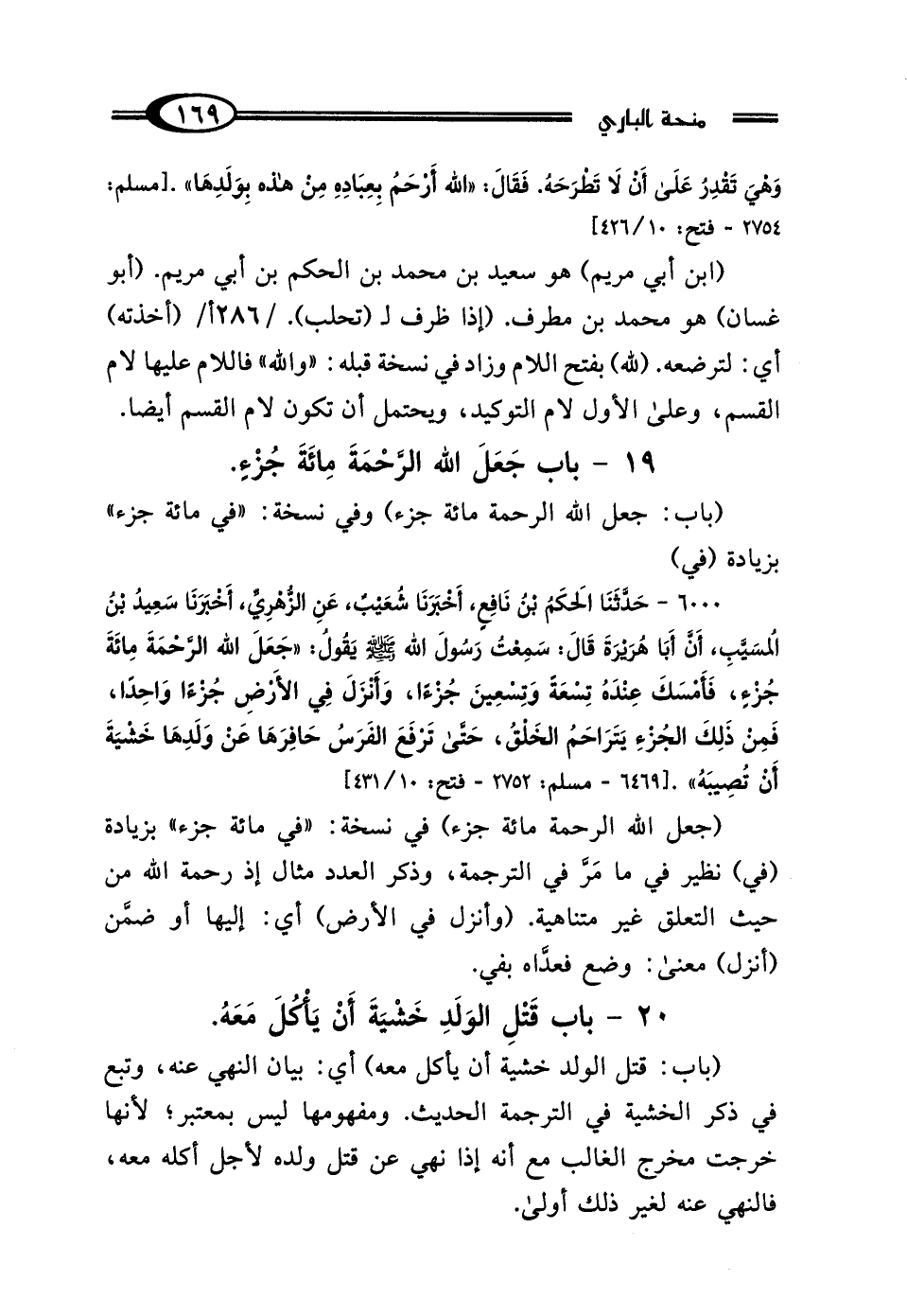 6000 - حَدَّثَنَا أَبُو اليَمَانِ الحَكَمُ بْنُ نَافِعٍ البَهْرَانِيُّ، أَخْبَرَنَا شُعَيْبٌ، عَنِ الزُّهْرِيِّ، أَخْبَرَنَا سَعِيدُ بْنُ المُسَيِّبِ، أَنَّ أَبَا هُرَيْرَةَ، قَال: سَمِعْتُ رَسُولَ اللَّهِ صَلَّى اللهُ عَلَيْهِ وَسَلَّمَ يَقُولُ: "جَعَلَ اللَّهُ الرَّحْمَةَ مِائَةَ جُزْءٍ، فَأَمْسَكَ عِنْدَهُ تِسْعَةً وَتِسْعِينَ جُزْءًا، وَأَنْزَلَ فِي الأَرْضِ جُزْءًا وَاحِدًا، فَمِنْ ذَلِكَ الجُزْءِ يَتَرَاحَمُ الخَلْقُ، حَتَّى تَرْفَعَ الفَرَسُ حَافِرَهَا عَنْ وَلَدِهَا، خَشْيَةَ أَنْ تُصِيبَهُ".