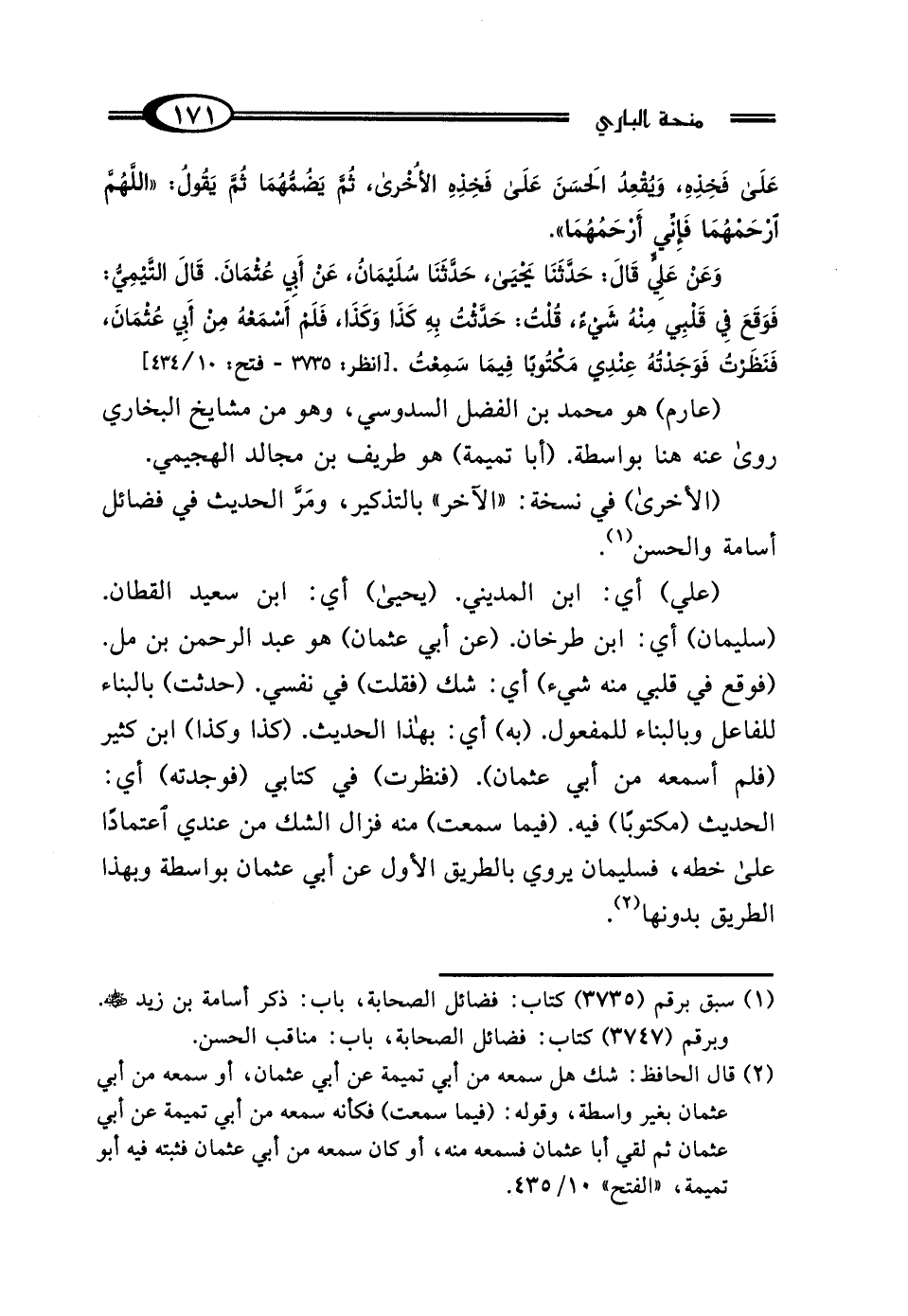(¬2) قال الحافظ: شك هل سمعه من أبي تميمة عن أبي عثمان، أو سمعه من أبي عثمان بغير واسطة، وقوله: (فيما سمعت) فكأنه سمعه من أبي تميمة عن أبي عثمان ثم لقي أبا عثمان فسمعه منه، أو كان سمعه من أبي عثمان فثبته فيه أبو تميمة، "الفتح" 10/ 435.