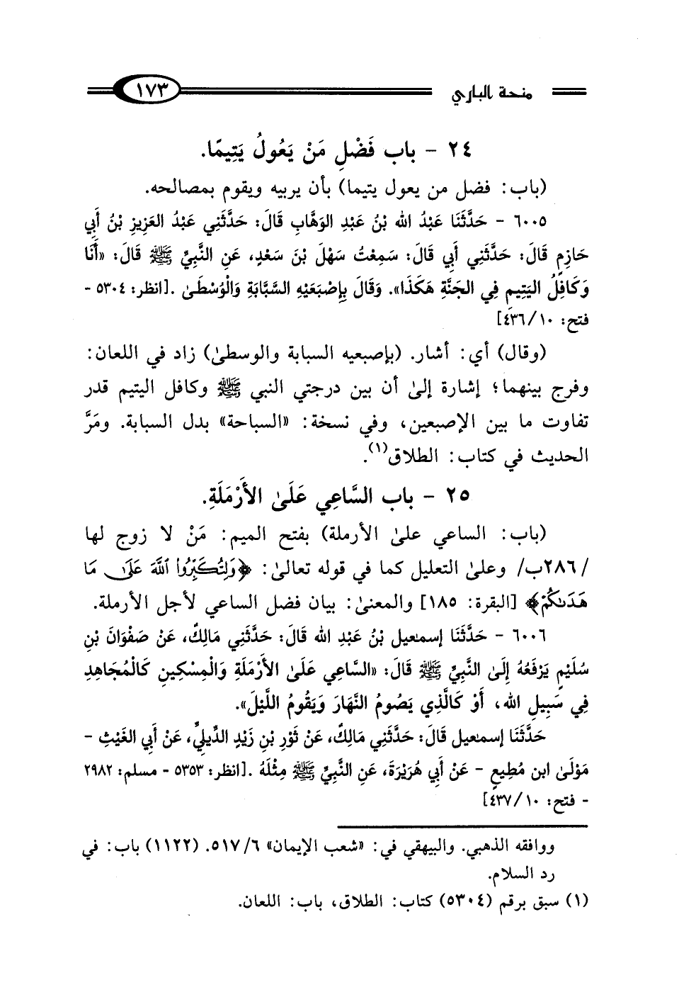 6005 - حَدَّثَنَا عَبْدُ اللَّهِ بْنُ عَبْدِ الوَهَّابِ، قَال: حَدَّثَنِي عَبْدُ العَزِيزِ بْنُ أَبِي حَازِمٍ، قَال: حَدَّثَنِي أَبِي، قَال: سَمِعْتُ سَهْلَ بْنَ سَعْدٍ، عَنِ النَّبِيِّ صَلَّى اللهُ عَلَيْهِ وَسَلَّمَ قَال: "أَنَا وَكَافِلُ اليَتِيمِ فِي الجَنَّةِ هَكَذَا" وَقَال بِإِصْبَعَيْهِ السَّبَّابَةِ وَالوُسْطَى.