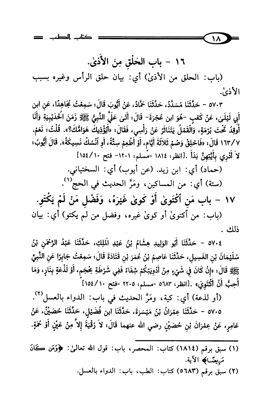 5703 - حَدَّثَنَا مُسَدَّدٌ، حَدَّثَنَا حَمَّادٌ، عَنْ أَيُّوبَ، قَال: سَمِعْتُ مُجَاهِدًا، عَنِ ابْنِ أَبِي لَيْلَى، عَنْ كَعْبٍ هُوَ ابْنُ عُجْرَةَ، قَال: أَتَى عَلَيَّ النَّبِيُّ صَلَّى اللهُ عَلَيْهِ وَسَلَّمَ زَمَنَ الحُدَيْبِيَةِ، وَأَنَا أُوقِدُ تَحْتَ بُرْمَةٍ، وَالقَمْلُ يَتَنَاثَرُ عَنْ رَأْسِي، فَقَال: "أَيُؤْذِيكَ هَوَامُّكَ؟ " قُلْتُ: نَعَمْ، قَال: "فَاحْلِقْ، وَصُمْ ثَلاثَةَ أَيَّامٍ، أَوْ أَطْعِمْ سِتَّةً، أَوْ انْسُكْ نَسِيكَةً" قَال أَيُّوبُ: لَا أَدْرِي بِأَيَّتِهِنَّ بَدَأَ.