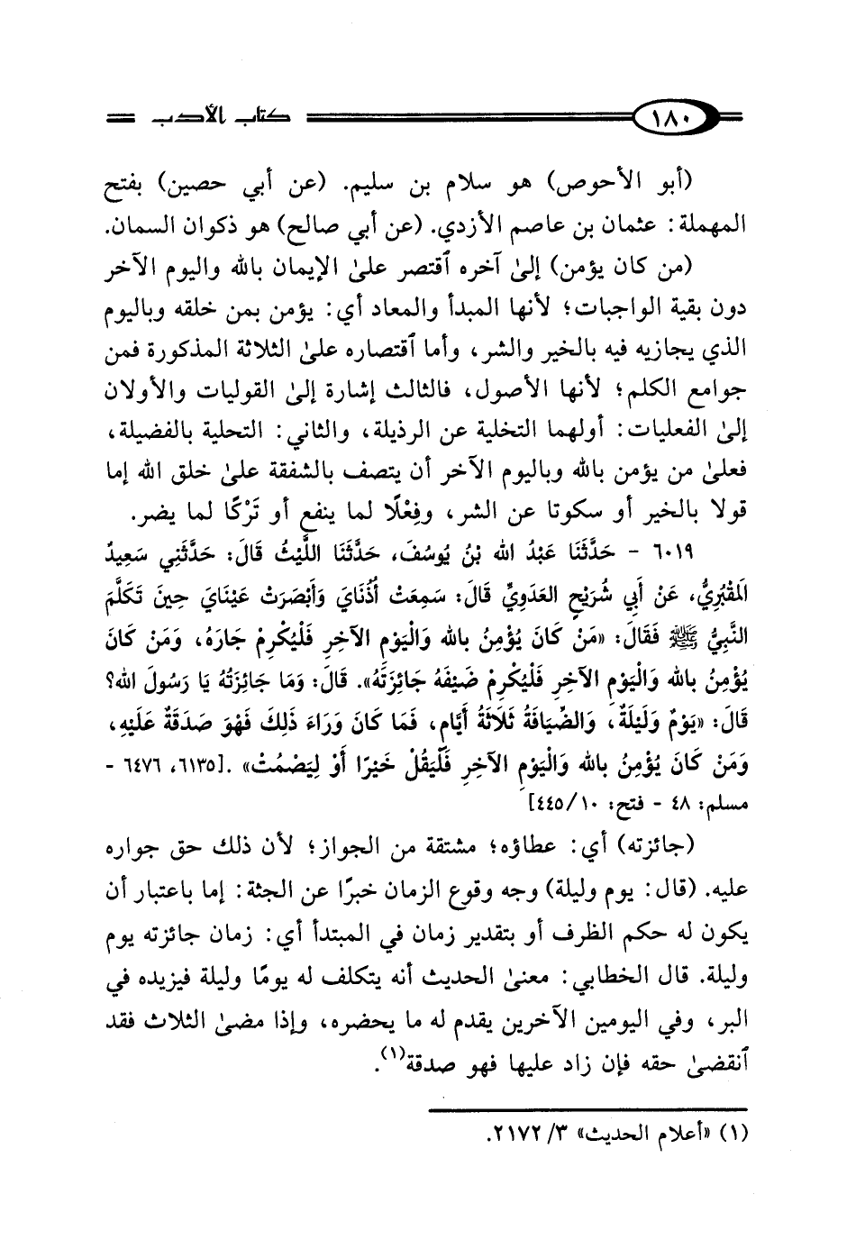 6019 - حَدَّثَنَا عَبْدُ اللَّهِ بْنُ يُوسُفَ، حَدَّثَنَا اللَّيْثُ، قَال: حَدَّثَنِي سَعِيدٌ المَقْبُرِيُّ، عَنْ أَبِي شُرَيْحٍ العَدَويِّ، قَال: سَمِعَتْ أُذُنَايَ، وَأَبْصَرَتْ عَيْنَايَ، حِينَ تَكَلَّمَ النَّبِيُّ صَلَّى اللهُ عَلَيْهِ وَسَلَّمَ فَقَال: "مَنْ كَانَ يُؤْمِنُ بِاللَّهِ وَاليَوْمِ الآخِرِ فَلْيُكْرِمْ جَارَهُ، وَمَنْ كَانَ يُؤْمِنُ بِاللَّهِ وَاليَوْمِ الآخِرِ فَلْيُكْرِمْ ضَيْفَهُ جَائِزَتَهُ" قَال: وَمَا جَائِزَتُهُ يَا رَسُولَ اللَّهِ؟ قَال: "يَوْمٌ وَلَيْلَةٌ، وَالضِّيَافَةُ ثَلاثَةُ أَيَّامٍ، فَمَا كَانَ وَرَاءَ ذَلِكَ فَهُوَ صَدَقَةٌ عَلَيْهِ، وَمَنْ كَانَ يُؤْمِنُ بِاللَّهِ وَاليَوْمِ الآخِرِ فَلْيَقُلْ خَيْرًا أَوْ لِيَصْمُتْ".