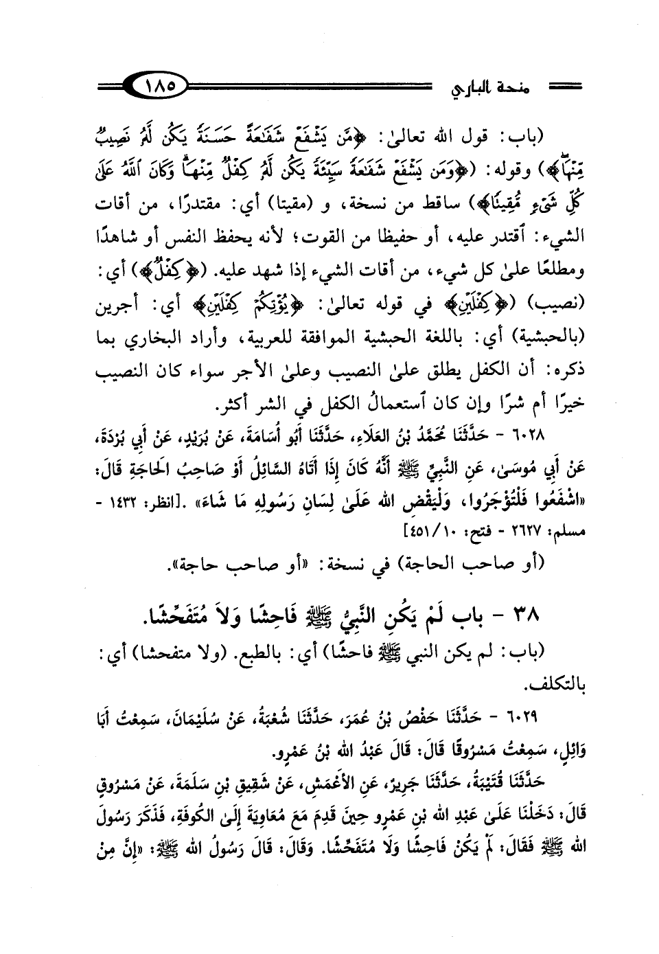 (باب: قول اللَّه تعالى: ({مَنْ يَشْفَعْ شَفَاعَةً حَسَنَةً يَكُنْ لَهُ نَصِيبٌ مِنْهَا}) وقوله: ({وَمَنْ يَشْفَعْ شَفَاعَةً سَيِّئَةً يَكُنْ لَهُ كِفْلٌ مِنْهَا وَكَانَ اللَّهُ عَلَى كُلِّ شَيْءٍ مُقِيتًا}) ساقط من نسخة، و (مقيتا) أي: مقتدرًا، من أقات الشيء: اقتدر عليه، أو حفيظا من القوت؛ لأنه يحفظ النفس أو شاهدًا ومطلعًا على كل شيء، من أقات الشيء إذا شهد عليه. ({كِفْلٌ}) أي: (نصيب) ({كِفْلَيْنِ}) في قوله تعالى: {يُؤْتِكُمْ كِفْلَيْنِ} أي: أجرين (بالحبشية) أي: باللغة الحبشية الموافقة للعربية، وأراد البخاري بما ذكره: أن الكفل يطلق على النصيب وعلى الأجر سواء كان النصيب خيرًا أم شرًّا وإن كان أستعمالُ الكفل في الشر أكثر.