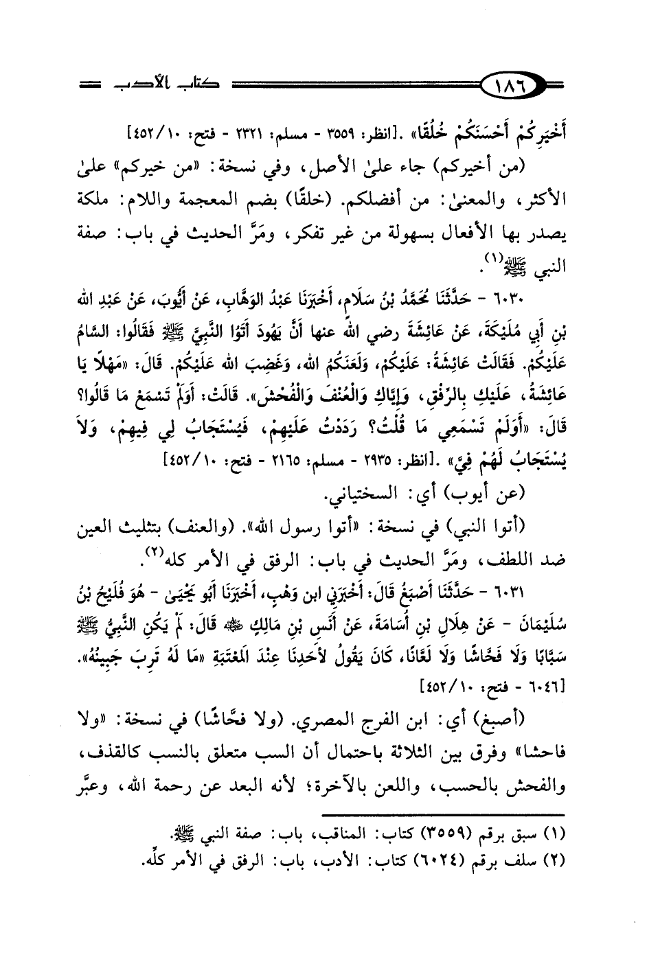 6030 - حَدَّثَنَا مُحَمَّدُ بْنُ سَلامٍ، أَخْبَرَنَا عَبْدُ الوَهَّابِ، عَنْ أَيُّوبَ، عَنْ عَبْدِ اللَّهِ بْنِ أَبِي مُلَيْكَةَ، عَنْ عَائِشَةَ، رَضِيَ اللَّهُ عَنْهَا: أَنَّ يَهُودَ أَتَوُا النَّبِيَّ صَلَّى اللهُ عَلَيْهِ وَسَلَّمَ فَقَالُوا: السَّامُ عَلَيْكُمْ، فَقَالتْ عَائِشَةُ: عَلَيْكُمْ، وَلَعَنَكُمُ اللَّهُ، وَغَضِبَ اللَّهُ عَلَيْكُمْ. قَال: "مَهْلًا يَا عَائِشَةُ، عَلَيْكِ بِالرِّفْقِ، وَإِيَّاكِ وَالعُنْفَ وَالفُحْشَ" قَالتْ: أَوَلَمْ تَسْمَعْ مَا قَالُوا؟ قَال: "أَوَلَمْ تَسْمَعِي مَا قُلْتُ؟ رَدَدْتُ عَلَيْهِمْ، فَيُسْتَجَابُ لِي فِيهِمْ، وَلَا يُسْتَجَابُ لَهُمْ فِيَّ".