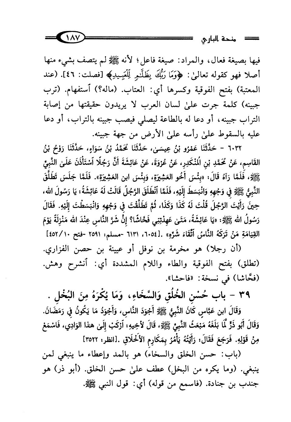 6032 - حَدَّثَنَا عَمْرُو بْنُ عِيسَى، حَدَّثَنَا مُحَمَّدُ بْنُ سَوَاءٍ، حَدَّثَنَا رَوْحُ بْنُ القَاسِمِ، عَنْ مُحَمَّدِ بْنِ المُنْكَدِرِ، عَنْ عُرْوَةَ، عَنْ عَائِشَةَ: أَنَّ رَجُلًا اسْتَأْذَنَ عَلَى النَّبِيِّ صَلَّى اللهُ عَلَيْهِ وَسَلَّمَ، فَلَمَّا رَآهُ قَال: "بِئْسَ أَخُو العَشِيرَةِ، وَبِئْسَ ابْنُ العَشِيرَةِ" فَلَمَّا جَلَسَ تَطَلَّقَ النَّبِيُّ صَلَّى اللهُ عَلَيْهِ وَسَلَّمَ فِي وَجْهِهِ وَانْبَسَطَ إِلَيْهِ، فَلَمَّا انْطَلَقَ الرَّجُلُ قَالتْ لَهُ عَائِشَةُ: يَا رَسُولَ اللَّهِ، حِينَ رَأَيْتَ الرَّجُلَ قُلْتَ لَهُ كَذَا وَكَذَا، ثُمَّ تَطَلَّقْتَ فِي وَجْهِهِ وَانْبَسَطْتَ إِلَيْهِ؟ فَقَال رَسُولُ اللَّهِ صَلَّى اللهُ عَلَيْهِ وَسَلَّمَ: "يَا عَائِشَةُ، مَتَى عَهِدْتِنِي فَحَّاشًا، إِنَّ شَرَّ النَّاسِ عِنْدَ اللَّهِ مَنْزِلَةً يَوْمَ القِيَامَةِ مَنْ تَرَكَهُ النَّاسُ اتِّقَاءَ شَرِّهِ".