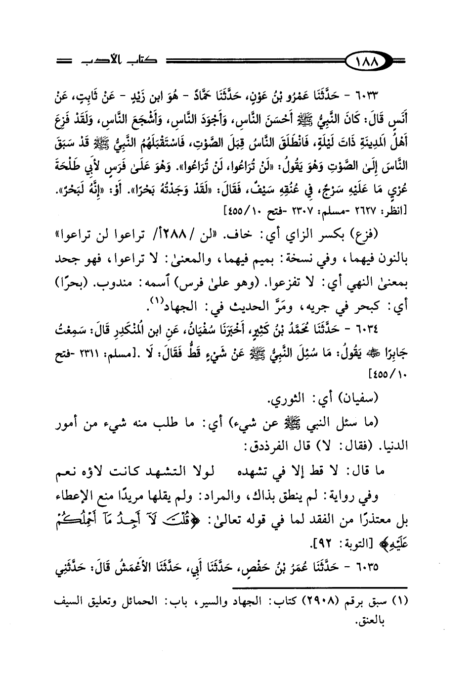 6033 - حَدَّثَنَا عَمْرُو بْنُ عَوْنٍ، حَدَّثَنَا حَمَّادٌ هُوَ ابْنُ زَيْدٍ، عَنْ ثَابِتٍ، عَنْ أَنَسٍ، قَال: كَانَ النَّبِيُّ صَلَّى اللهُ عَلَيْهِ وَسَلَّمَ أَحْسَنَ النَّاسِ، وَأَجْوَدَ النَّاسِ، وَأَشْجَعَ النَّاسِ، وَلَقَدْ فَزِعَ أَهْلُ المَدِينَةِ ذَاتَ لَيْلَةٍ، فَانْطَلَقَ النَّاسُ قِبَلَ الصَّوْتِ، فَاسْتَقْبَلَهُمُ النَّبِيُّ صَلَّى اللهُ عَلَيْهِ وَسَلَّمَ قَدْ سَبَقَ النَّاسَ إِلَى الصَّوْتِ، وَهُوَ يَقُولُ: "لَنْ تُرَاعُوا لَنْ تُرَاعُوا" وَهُوَ عَلَى فَرَسٍ لِأَبِي طَلْحَةَ عُرْيٍ مَا عَلَيْهِ سَرْجٌ، فِي عُنُقِهِ سَيْفٌ، فَقَال: "لَقَدْ وَجَدْتُهُ بَحْرًا. أَوْ: إِنَّهُ لَبَحْرٌ".