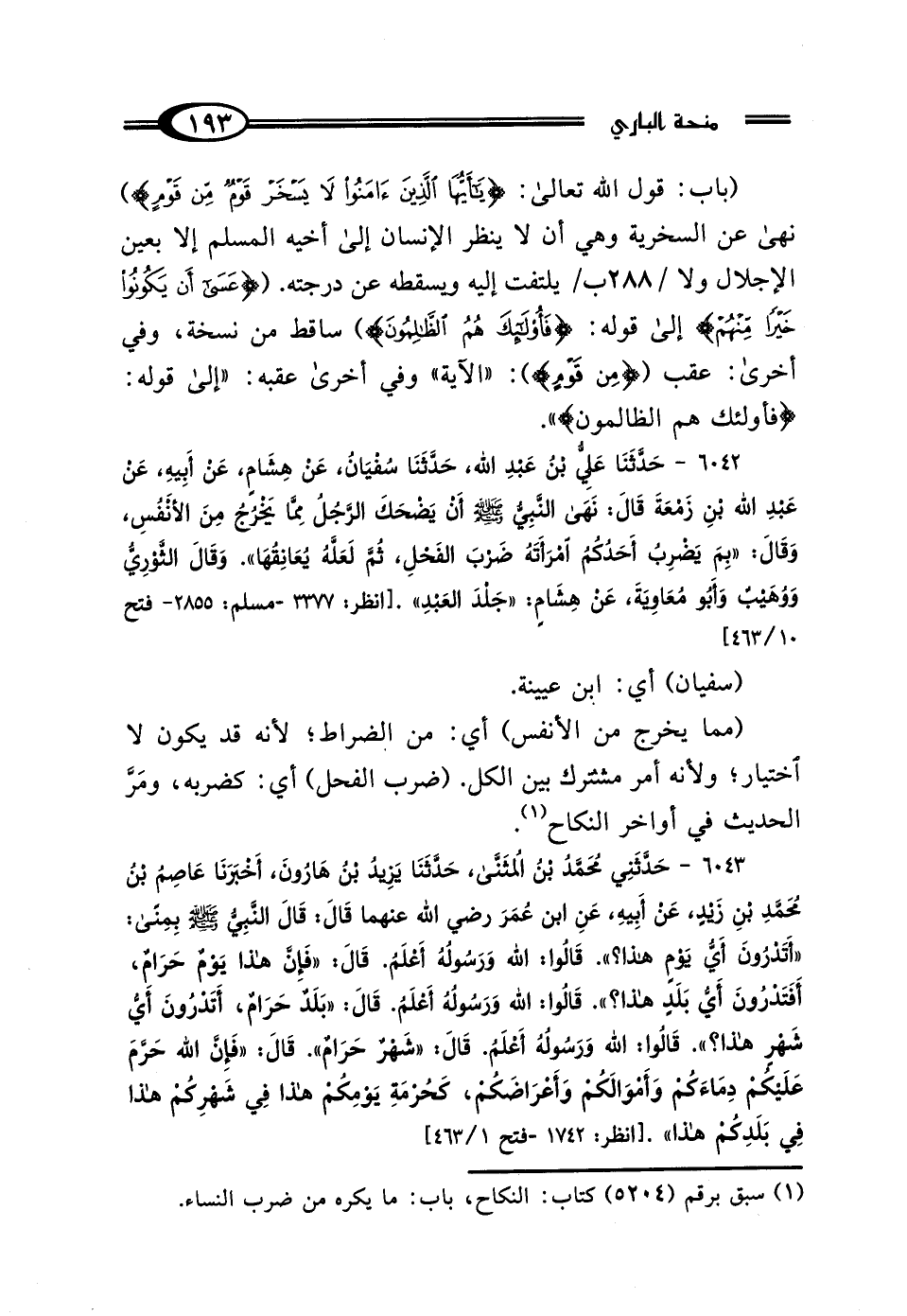 6042 - حَدَّثَنَا عَلِيُّ بْنُ عَبْدِ اللَّهِ، حَدَّثَنَا سُفْيَانُ، عَنْ هِشَامٍ، عَنْ أَبِيهِ، عَنْ عَبْدِ اللَّهِ بْنِ زَمْعَةَ، قَال: نَهَى النَّبِيُّ صَلَّى اللهُ عَلَيْهِ وَسَلَّمَ أَنْ يَضْحَكَ الرَّجُلُ مِمَّا يَخْرُجُ مِنَ الأَنْفُسِ، وَقَال: "بِمَ يَضْرِبُ أَحَدُكُمُ امْرَأَتَهُ ضَرْبَ الفَحْلِ، أَو العَبْدِ، ثُمَّ لَعَلَّهُ يُعَانِقُهَا" وَقَال الثَّوْرِيُّ، وَوُهَيْبٌ، وَأَبُومُعَاويَةَ، عَنْ هِشَامٍ: "جَلْدَ العَبْدِ".