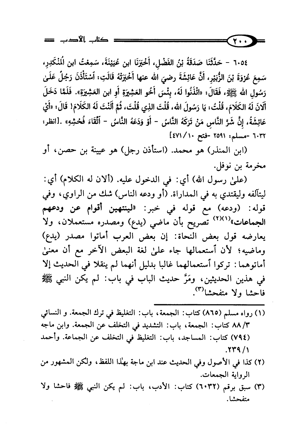 6054 - حَدَّثَنَا صَدَقَةُ بْنُ الفَضْلِ، أَخْبَرَنَا ابْنُ عُيَيْنَةَ، سَمِعْتُ ابْنَ المُنْكَدِرِ، سَمِعَ عُرْوَةَ بْنَ الزُّبَيْرِ: أَنَّ عَائِشَةَ، رَضِيَ اللَّهُ عَنْهَا أَخْبَرَتْهُ قَالتْ: اسْتَأْذَنَ رَجُلٌ عَلَى رَسُولِ اللَّهِ صَلَّى اللهُ عَلَيْهِ وَسَلَّمَ فَقَال: "ائْذَنُوا لَهُ، بِئْسَ أَخُو العَشِيرَةِ، أَو ابْنُ العَشِيرَةِ" فَلَمَّا دَخَلَ أَلانَ لَهُ الكَلامَ، قُلْتُ: يَا رَسُولَ اللَّهِ، قُلْتَ الَّذِي قُلْتَ، ثُمَّ أَلَنْتَ لَهُ الكَلامَ؟ قَال: "أَيْ عَائِشَةُ، إِنَّ شَرَّ النَّاسِ مَنْ تَرَكَهُ النَّاسُ، أَوْ وَدَعَهُ النَّاسُ، اتِّقَاءَ فُحْشِهِ".