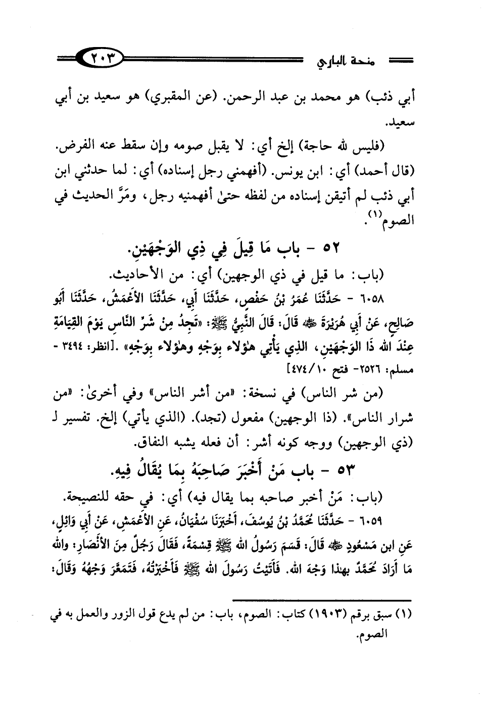 6058 - حَدَّثَنَا عُمَرُ بْنُ حَفْصٍ، حَدَّثَنَا أَبِي، حَدَّثَنَا الأَعْمَشُ، حَدَّثَنَا أَبُو صَالِحٍ، عَنْ أَبِي هُرَيْرَةَ رَضِيَ اللَّهُ عَنْهُ، قَال: قَال النَّبِيُّ صَلَّى اللهُ عَلَيْهِ وَسَلَّمَ: "تَجِدُ مِنْ شَرِّ النَّاسِ يَوْمَ القِيَامَةِ عِنْدَ اللَّهِ ذَا الوَجْهَيْنِ، الَّذِي يَأْتِي هَؤُلاءِ بِوَجْهٍ، وَهَؤُلاءِ بِوَجْهٍ".