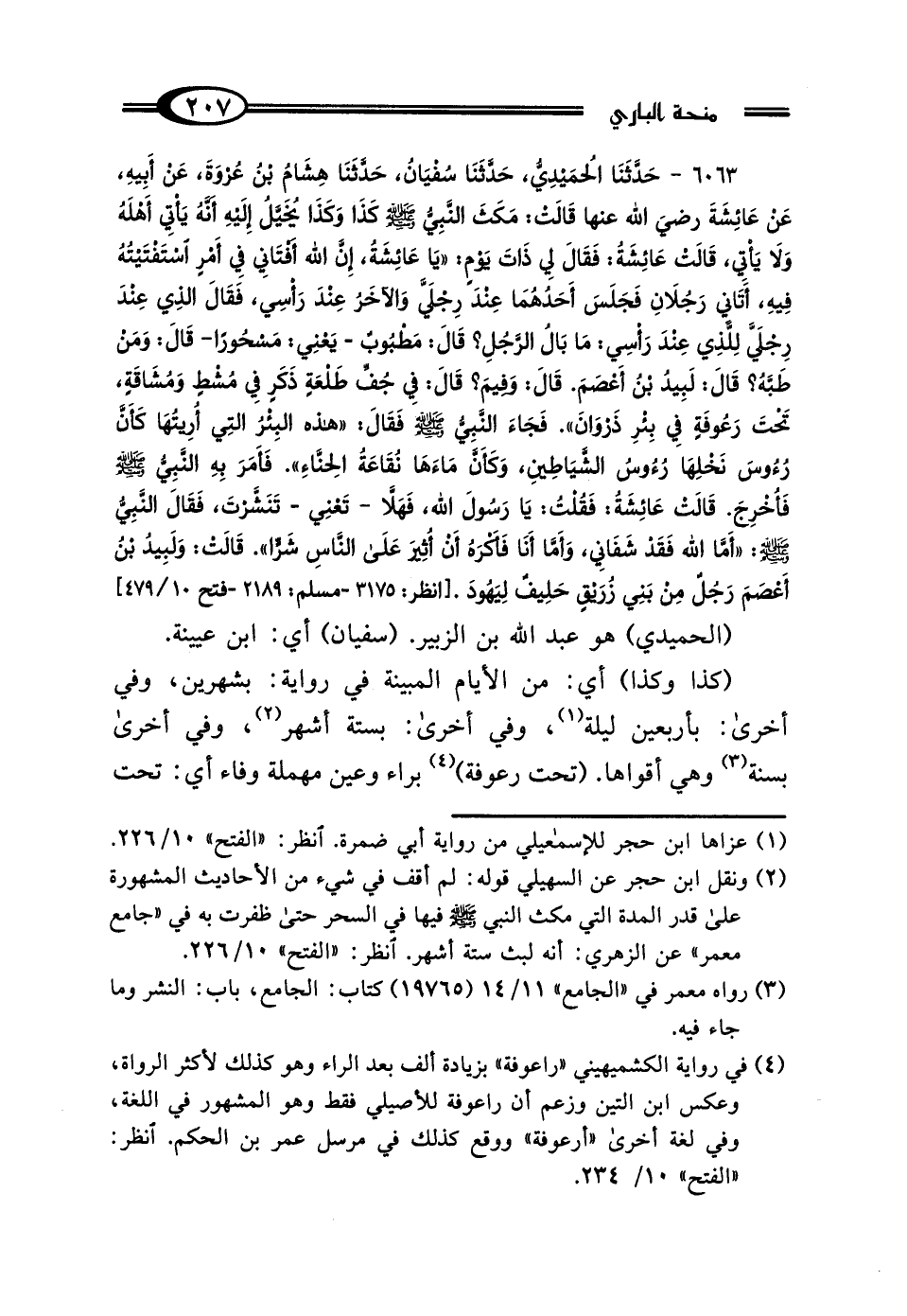 6063 - حَدَّثَنَا الحُمَيْدِيُّ، حَدَّثَنَا سُفْيَانُ، حَدَّثَنَا هِشَامُ بْنُ عُرْوَةَ، عَنْ أَبِيهِ، عَنْ عَائِشَةَ، رَضِيَ اللَّهُ عَنْهَا قَالتْ: مَكَثَ النَّبِيُّ صَلَّى اللهُ عَلَيْهِ وَسَلَّمَ كَذَا وَكَذَا، يُخَيَّلُ إِلَيْهِ أَنَّهُ يَأْتِي أَهْلَهُ وَلَا يَأْتِي، قَالتْ عَائِشَةُ: فَقَال لِي ذَاتَ يَوْمٍ: "يَا عَائِشَةُ، إِنَّ اللَّهَ أَفْتَانِي فِي أَمْرٍ اسْتَفْتَيْتُهُ فِيهِ: أَتَانِي رَجُلانِ، فَجَلَسَ أَحَدُهُمَا عِنْدَ رِجْلَيَّ وَالآخَرُ عِنْدَ رَأْسِي، فَقَال الَّذِي عِنْدَ رِجْلَيَّ لِلَّذِي عِنْدَ رَأْسِي: مَا بَالُ الرَّجُلِ؟ قَال: مَطْبُوبٌ، يَعْنِي مَسْحُورًا، قَال: وَمَنْ طَبَّهُ؟ قَال: لَبِيدُ بْنُ أَعْصَمَ، قَال: وَفِيمَ؟ قَال: فِي جُفِّ طَلْعَةٍ ذَكَرٍ فِي مُشْطٍ وَمُشَاقَةٍ، تَحْتَ رَعُوفَةٍ فِي بِئْرِ ذَرْوَانَ " فَجَاءَ النَّبِيُّ صَلَّى اللهُ عَلَيْهِ وَسَلَّمَ فَقَال: "هَذِهِ البِئْرُ الَّتِي أُرِيتُهَا، كَأَنَّ رُءُوسَ نَخْلِهَا رُءُوسُ الشَّيَاطِينِ، وَكَأَنَّ مَاءَهَا نُقَاعَةُ الحِنَّاءِ" فَأَمَرَ بِهِ النَّبِيُّ صَلَّى اللهُ عَلَيْهِ وَسَلَّمَ فَأُخْرِجَ، قَالتْ عَائِشَةُ: فَقُلْتُ: يَا رَسُولَ اللَّهِ فَهَلَّا، تَعْنِي تَنَشَّرْتَ؟ فَقَال النَّبِيُّ صَلَّى اللهُ عَلَيْهِ وَسَلَّمَ: "أَمَّا اللَّهُ فَقَدْ شَفَانِي، وَأَمَّا أَنَا فَأَكْرَهُ أَنْ أُثِيرَ عَلَى النَّاسِ شَرًّا" قَالتْ: وَلَبِيدُ بْنُ أَعْصَمَ، رَجُلٌ مِنْ بَنِي زُرَيْقٍ، حَلِيفٌ لِيَهُودَ.