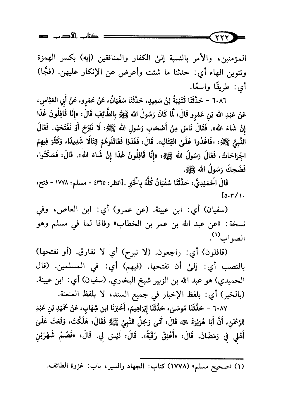 6086 - حَدَّثَنَا قُتَيْبَةُ بْنُ سَعِيدٍ، حَدَّثَنَا سُفْيَانُ، عَنْ عَمْرٍو، عَنْ أَبِي العَبَّاسِ، عَنِ ابْنِ عُمَرَ، قَال: لَمَّا كَانَ رَسُولُ اللَّهِ صَلَّى اللهُ عَلَيْهِ وَسَلَّمَ بِالطَّائِفِ، قَال: "إِنَّا قَافِلُونَ غَدًا إِنْ شَاءَ اللَّهُ" فَقَال نَاسٌ مِنْ أَصْحَابِ رَسُولِ اللَّهِ صَلَّى اللهُ عَلَيْهِ وَسَلَّمَ: لَا نَبْرَحُ أَوْ نَفْتَحَهَا، فَقَال النَّبِيُّ صَلَّى اللهُ عَلَيْهِ وَسَلَّمَ: "فَاغْدُوا عَلَى القِتَالِ" قَال: فَغَدَوْا فَقَاتَلُوهُمْ قِتَالًا شَدِيدًا، وَكَثُرَ فِيهِمُ الجِرَاحَاتُ، فَقَال رَسُولُ اللَّهِ صَلَّى اللهُ عَلَيْهِ وَسَلَّمَ: "إِنَّا قَافِلُونَ غَدًا إِنْ شَاءَ اللَّهُ" قَال: فَسَكَتُوا، فَضَحِكَ رَسُولُ اللَّهِ صَلَّى اللهُ عَلَيْهِ وَسَلَّمَ، قَال الحُمَيْدِيُّ: حَدَّثَنَا سُفْيَانُ: بِالخَبَرِ كُلِّهِ.