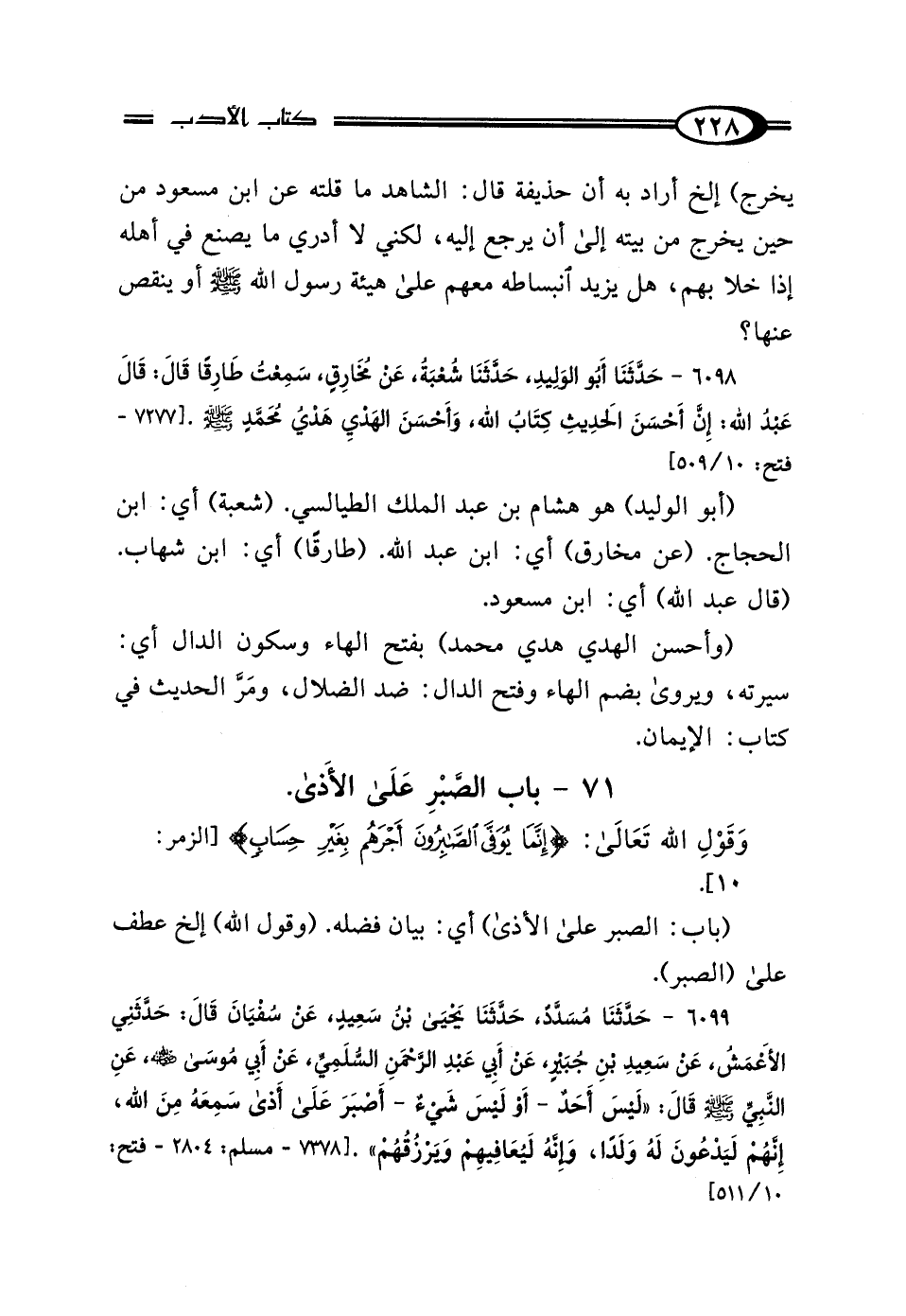 6098 - حَدَّثَنَا أَبُو الوَلِيدِ، حَدَّثَنَا شُعْبَةُ، عَنْ مُخَارِقٍ، سَمِعْتُ طَارِقًا، قَال: قَال عَبْدُ اللَّهِ: "إِنَّ أَحْسَنَ الحَدِيثِ كِتَابُ اللَّهِ، وَأَحْسَنَ الهَدْيِ هَدْيُ مُحَمَّدٍ صَلَّى اللهُ عَلَيْهِ وَسَلَّمَ".