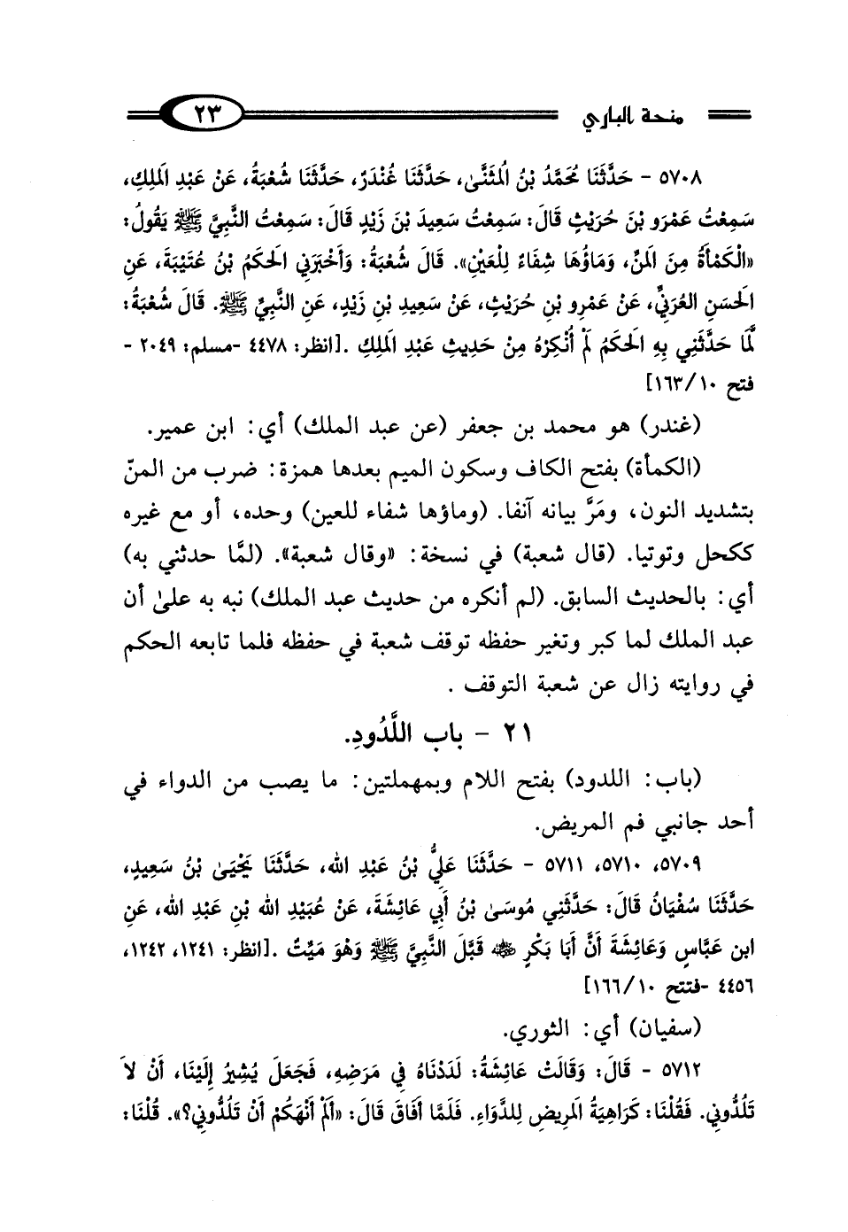 5712 - قَال: وَقَالتْ عَائِشَةُ: لَدَدْنَاهُ فِي مَرَضِهِ فَجَعَلَ يُشِيرُ إِلَيْنَا: "أَنْ لَا تَلُدُّونِي"، فَقُلْنَا: كَرَاهِيَةُ المَرِيضِ لِلدَّوَاءِ، فَلَمَّا أَفَاقَ قَال: "أَلَمْ أَنْهَكُمْ أَنْ تَلُدُّونِي؟ " قُلْنَا: