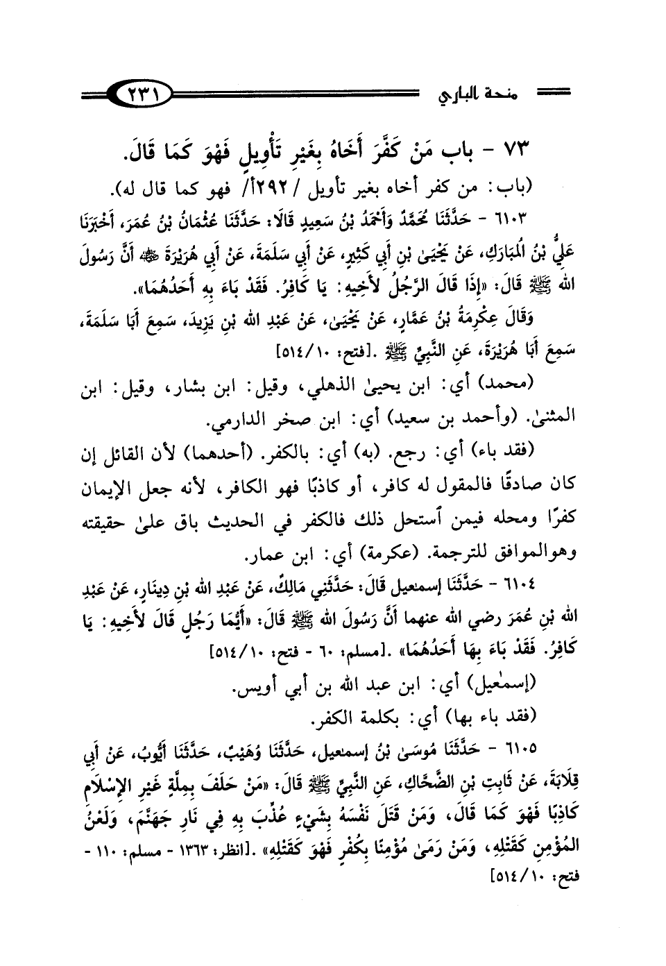 73 - بَابُ مَنْ كَفَّرَ أَخَاهُ بِغَيْرِ تَأْويلٍ فَهُوَ كَمَا قَال