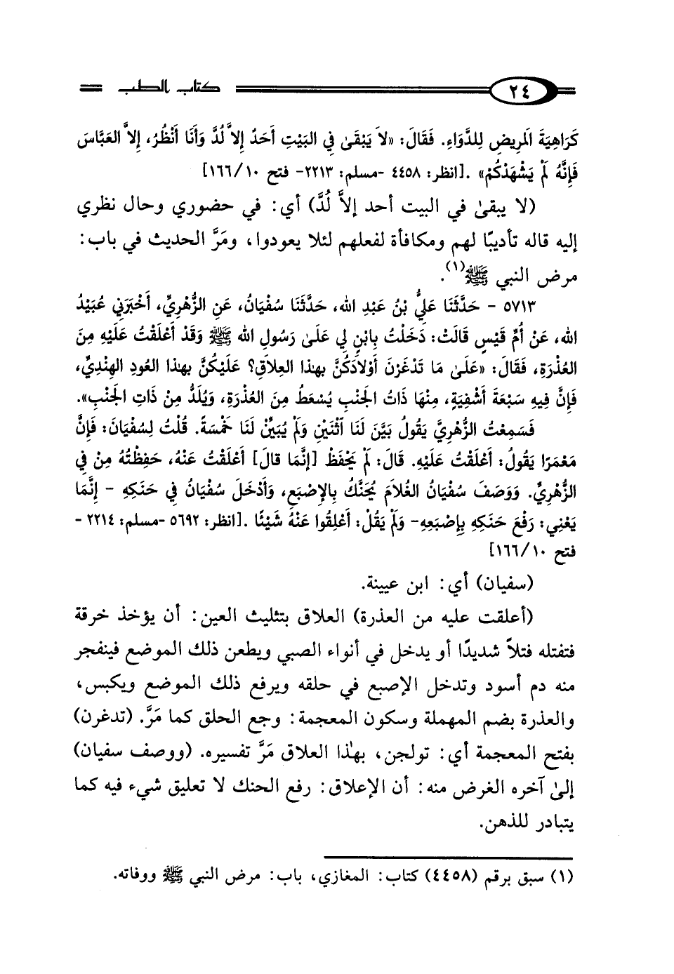 5713 - حَدَّثَنَا عَلِيُّ بْنُ عَبْدِ اللَّهِ، حَدَّثَنَا سُفْيَانُ، عَنِ الزُّهْرِيِّ، أَخْبَرَنِي عُبَيْدُ اللَّهِ بْنُ عَبْدِ اللَّهِ، عَنْ أُمِّ قَيْسٍ، قَالتْ: دَخَلْتُ بِابْنٍ لِي عَلَى رَسُولِ اللَّهِ صَلَّى اللهُ عَلَيْهِ وَسَلَّمَ، وَقَدْ أَعْلَقْتُ عَلَيْهِ مِنَ العُذْرَةِ، فَقَال: "عَلَى مَا تَدْغَرْنَ أَوْلادَكُنَّ بِهَذَا العِلاقِ، عَلَيْكُنَّ بِهَذَا العُودِ الهِنْدِيِّ، فَإِنَّ فِيهِ سَبْعَةَ أَشْفِيَةٍ، مِنْهَا ذَاتُ الجَنْبِ: يُسْعَطُ مِنَ العُذْرَةِ، وَيُلَدُّ مِنْ ذَاتِ الجَنْبِ " فَسَمِعْتُ الزُّهْرِيَّ يَقُولُ: بَيَّنَ لَنَا اثْنَيْنِ، وَلَمْ يُبَيِّنْ لَنَا خَمْسَةً، قُلْتُ لِسُفْيَانَ: فَإِنَّ مَعْمَرًا يَقُولُ: أَعْلَقْتُ عَلَيْهِ؟ قَال: لَمْ يَحْفَظْ [إِنَّمَا قَال] أَعْلَقْتُ عَنْهُ، حَفِظْتُهُ مِنْ فِي الزُّهْرِيِّ، وَوَصَفَ سُفْيَانُ الغُلامَ يُحَنَّكُ بِالإِصْبَعِ، وَأَدْخَلَ سُفْيَانُ فِي حَنَكِهِ، إِنَّمَا يَعْنِي رَفْعَ حَنَكِهِ بِإِصْبَعِهِ، وَلَمْ يَقُلْ: أَعْلِقُوا عَنْهُ شَيْئًا.