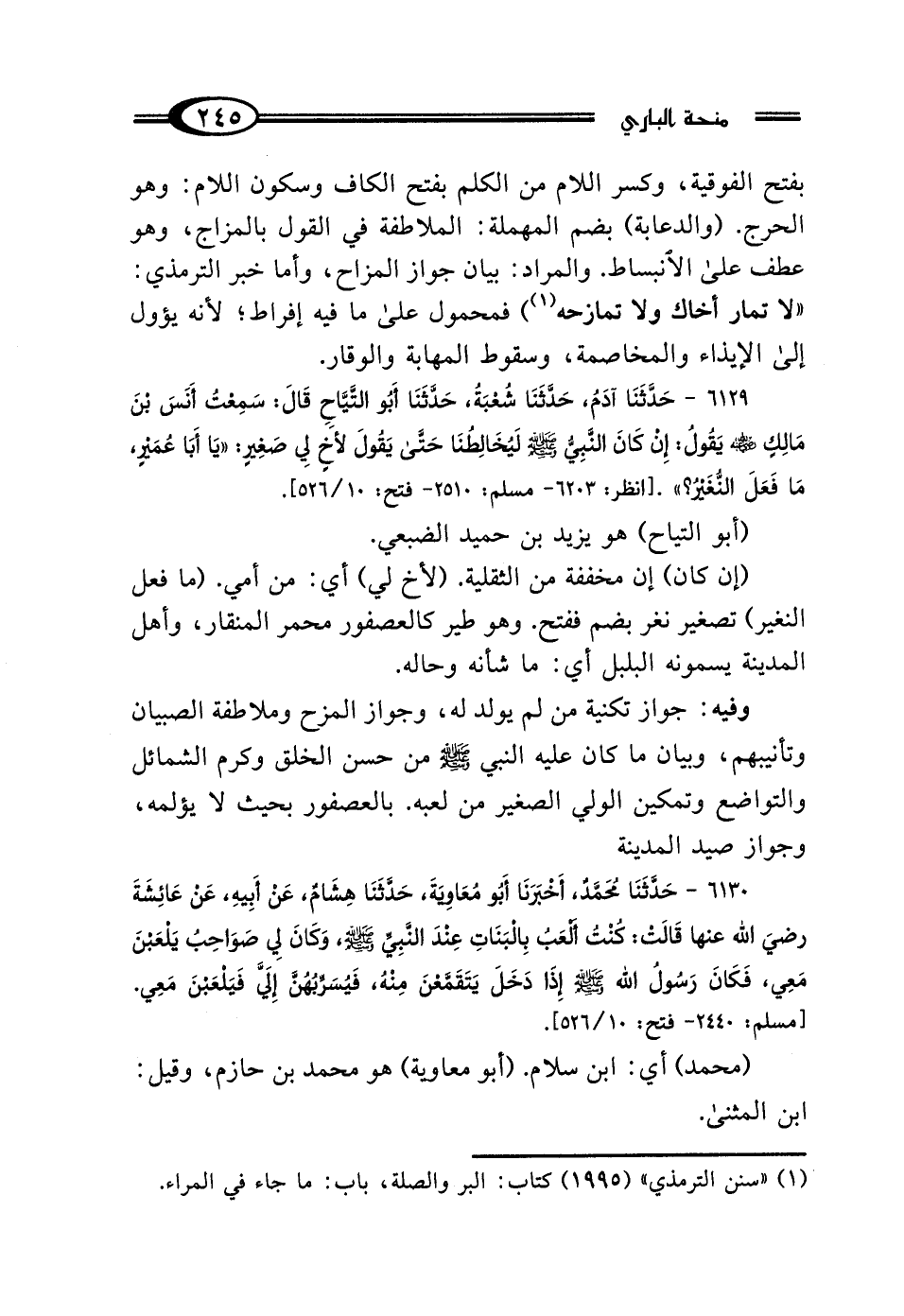 6129 - حَدَّثَنَا آدَمُ، حَدَّثَنَا شُعْبَةُ، حَدَّثَنَا أَبُو التَّيَّاحِ، قَال: سَمِعْتُ أَنَسَ بْنَ مَالِكٍ رَضِيَ اللَّهُ عَنْهُ، يَقُولُ: إِنْ كَانَ النَّبِيُّ صَلَّى اللهُ عَلَيْهِ وَسَلَّمَ لَيُخَالِطُنَا، حَتَّى يَقُولَ لِأَخٍ لِي صَغِيرٍ: "يَا أَبَا عُمَيْرٍ، مَا فَعَلَ النُّغَيْرُ؟ ".