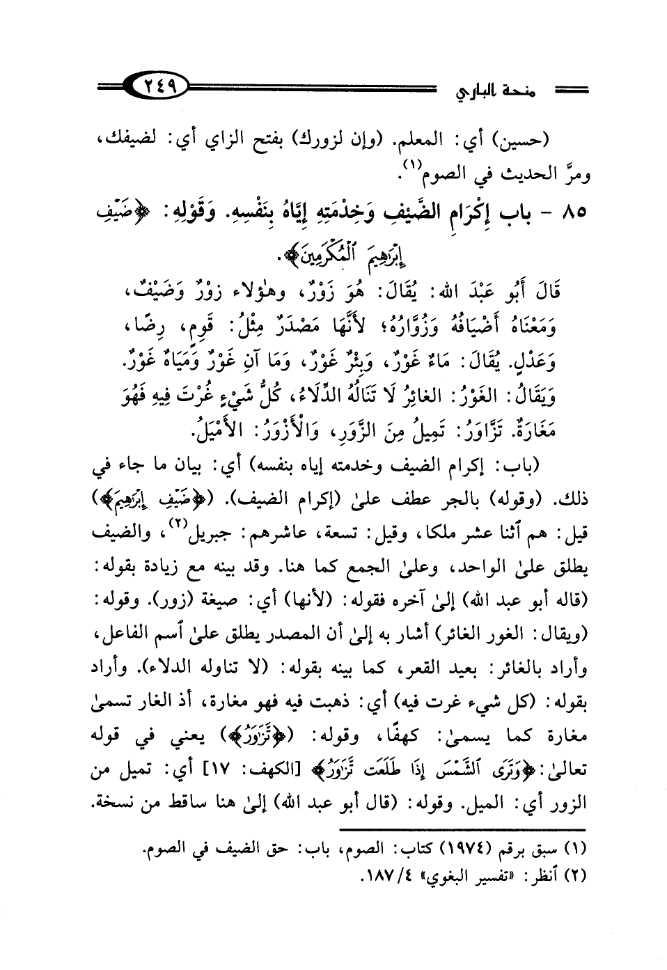 (باب: إكرام الضيف وخدمته إياه بنفسه) أي: بيان ما جاء في ذلك. (وقوله) بالجر عطف على (إكرام الضيف). ({ضَيْفِ إِبْرَاهِيمَ}) قيل: هم اثنا عشر ملكا، وقيل: تسعة، عاشرهم: جبريل (¬2)، والضيف يطلق على الواحد، وعلى الجمع كما هنا. وقد بينه مع زيادة بقوله: (قاله أبو عبد اللَّه) إلى آخره فقوله: (لأنها) أي: صيغة (زور). وقوله: (ويقال: الغور الغائر) أشار به إلى أن المصدر يطلق على اسم الفاعل، وأراد بالغائر: بعيد القعر، كما بينه بقوله: (لا تناوله الدلاء). وأراد بقوله: (كل شيء غرت فيه) أي: ذهبت فيه فهو مغارة، إذ الغار تسمى مغارة كما يسمى: كهفًا، وقوله: ({تَزَاوَرُ}) يعني في قوله تعالى: {وَتَرَى الشَّمْسَ إِذَا طَلَعَتْ تَزَاوَرُ} [الكهف: 17] أي: تميل من الزور أي: الميل. وقوله: (قال أبو عبد اللَّه) إلى هنا ساقط من نسخة.