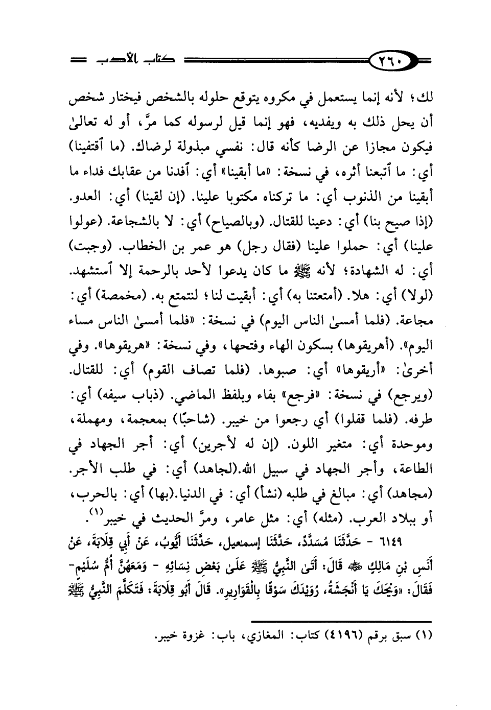 لك؛ لأنه إنما يستعمل في مكروه يتوقع حلوله بالشخص فيختار شخص أن يحل ذلك به ويفديه، فهو إنما قيل لرسوله كما مرَّ، أو له تعالى فيكون مجازًا عن الرضا كأنه قال: نفسي مبذولة لرضاك. (ما اقتفينا) أي: ما اتبعنا أثره، في نسخة: "ما أبقينا" أي: افدنا من عقابك فداء ما أبقينا من الذنوب أي: ما تركناه مكتوبا علينا. (إن لقينا) أي: العدو. (إذا صيح بنا) أي: دعينا للقتال. (وبالصياح) أي: لا بالشجاعة. (عولوا علينا) أي: حملوا علينا (فقال رجل) هو عمر بن الخطاب. (وجبت) أي: له الشهادة؛ لأنه - صلى اللَّه عليه وسلم - ما كان يدعوا لأحد بالرحمة إلا استشهد. (لولا) أي: هلا. (أمتعتنا به) أي: أبقيت لنا؛ لنتمتع به. (مخمصة) أي: مجاعة. (فلما أمسى الناس اليوم) في نسخة: "فلما أمسى الناس مساء اليوم". (أهريقوها) بسكون الهاء وفتحها، وفي نسخة: "هريقوها". وفي أخرى: "أريقوها" أي: صبوها. (فلما تصاف القوم) أي: للقتال. (ويرجع) في نسخة: "فرجع" بفاء وبلفظ الماضي. (ذباب سيفه) أي: طرفه. (فلما قفلوا) أي رجعوا من خيبر. (شاحبًا) بمعجمة، ومهملة، وموحدة أي: متغير اللون. (إن له لأجرين) أي: أجر الجهاد في الطاعة، وأجر الجهاد في سبيل اللَّه. (لجاهد) أي: في طلب الأجر. (مجاهد) أي: مبالغ في طلبه (نشأ) أي: في الدنيا. (بها) أي: بالحرب، أو ببلاد العرب. (مثله) أي: مثل عامر، ومرَّ الحديث في خيبر (¬1).
