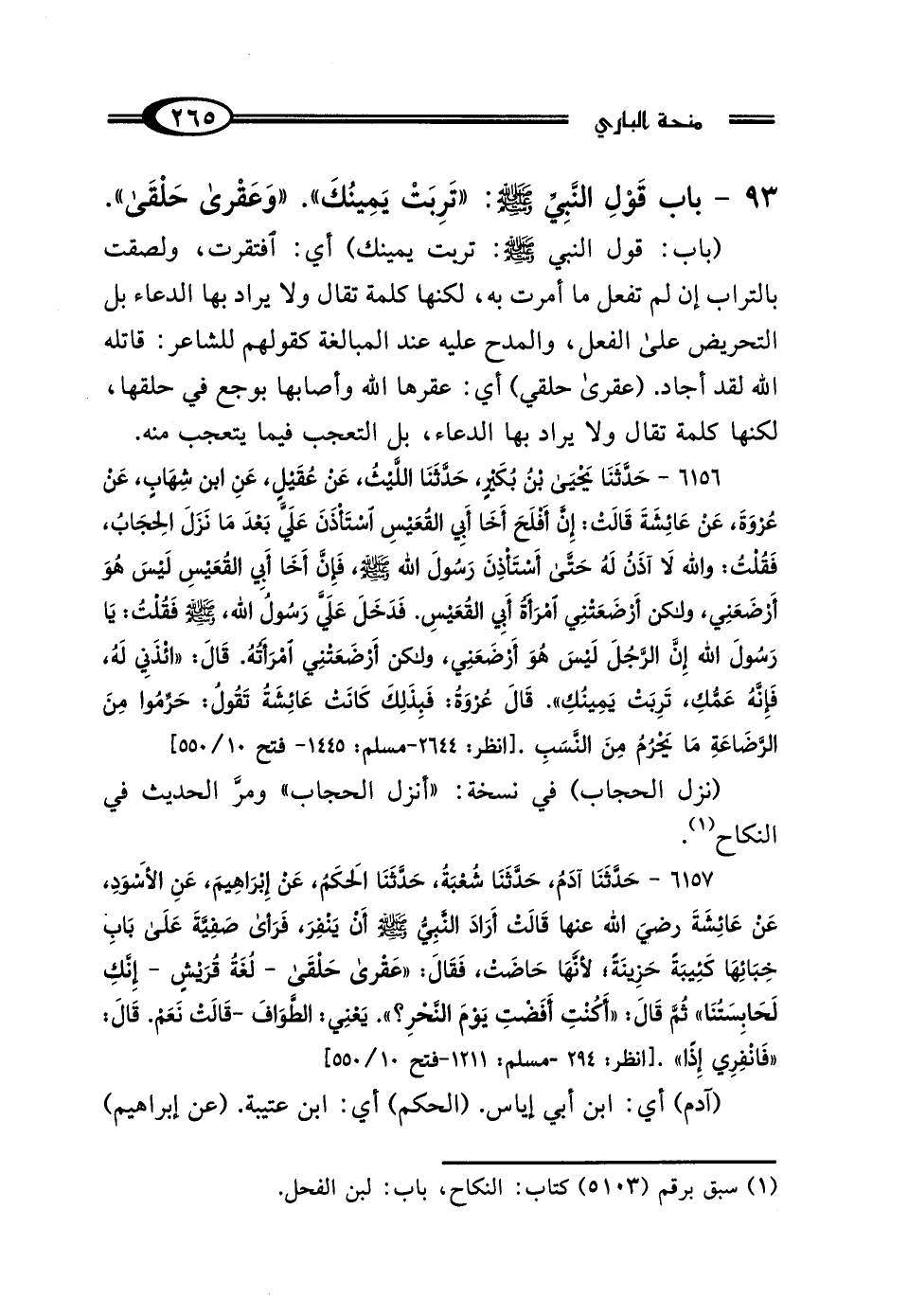93 - بَابُ قَوْلِ النَّبِيِّ صَلَّى اللهُ عَلَيْهِ وَسَلَّمَ: "تَرِبَتْ يَمِينُكِ، وَعَقْرَى حَلْقَى"