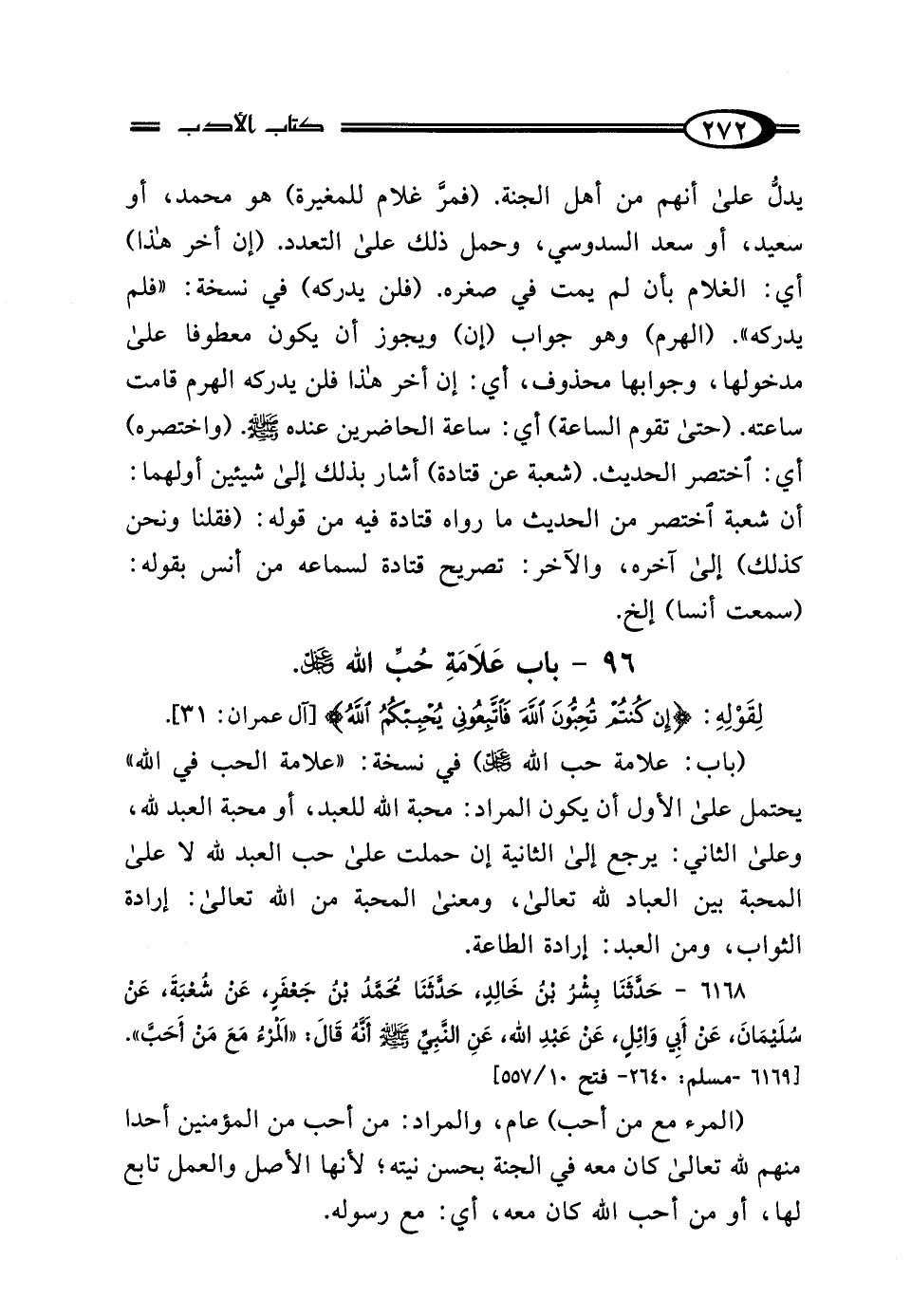 6168 - حَدَّثَنَا بِشْرُ بْنُ خَالِدٍ، حَدَّثَنَا مُحَمَّدُ بْنُ جَعْفَرٍ، عَنْ شُعْبَةَ، عَنْ سُلَيْمَانَ، عَنْ أَبِي وَائِلٍ، عَنْ عَبْدِ اللَّهِ: عَنِ النَّبِيِّ صَلَّى اللهُ عَلَيْهِ وَسَلَّمَ أَنَّهُ قَال: "المَرْءُ مَعَ مَنْ أَحَبَّ".