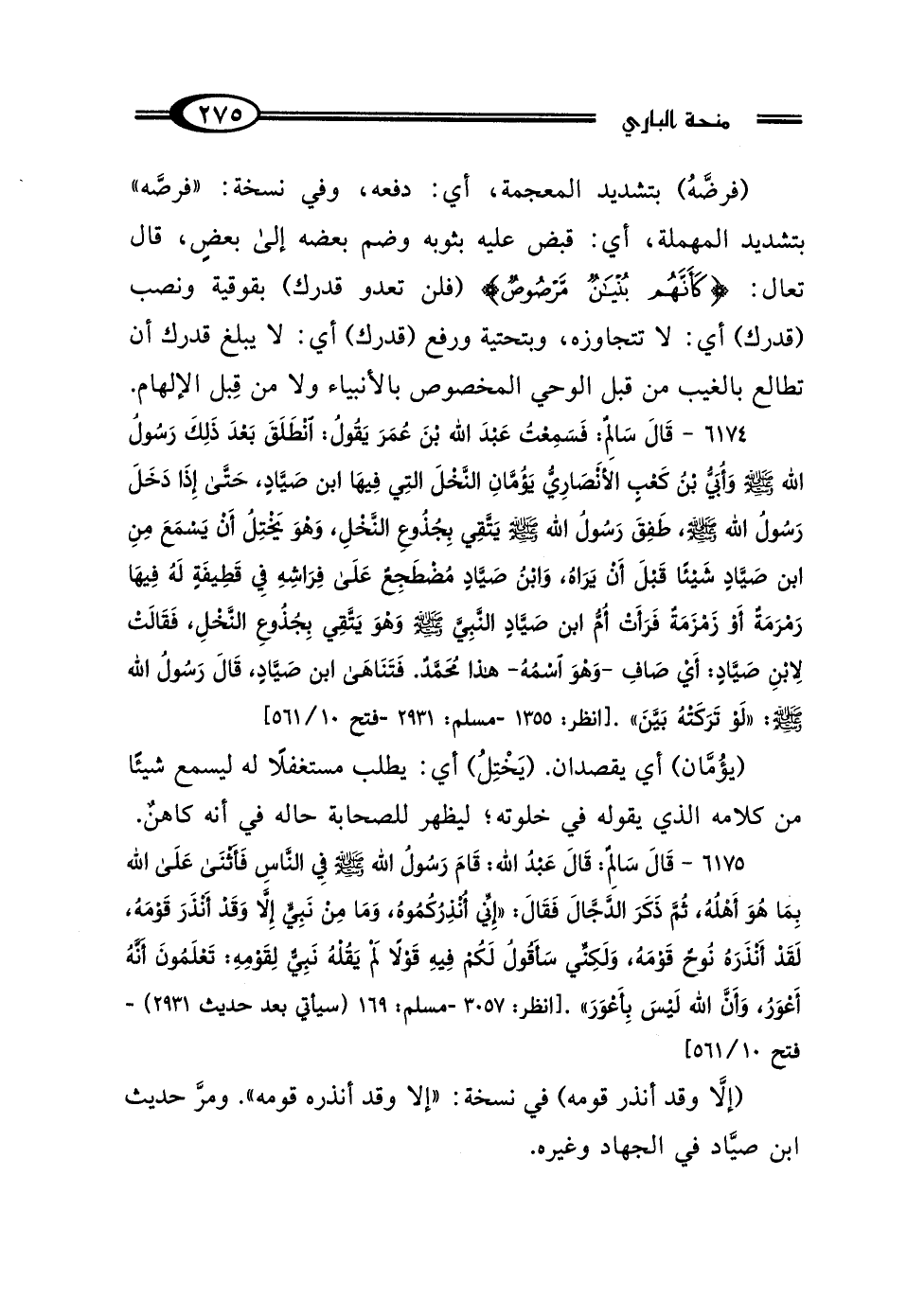 6174 - قَال سَالِمٌ: فَسَمِعْتُ عَبْدَ اللَّهِ بْنَ عُمَرَ، يَقُولُ: انْطَلَقَ بَعْدَ ذَلِكَ رَسُولُ اللَّهِ صَلَّى اللهُ عَلَيْهِ وَسَلَّمَ وَأُبَيُّ بْنُ كَعْبٍ الأَنْصَارِيُّ، يَؤُمَّانِ النَّخْلَ الَّتِي فِيهَا ابْنُ صَيَّادٍ، حَتَّى إِذَا دَخَلَ رَسُولُ اللَّهِ صَلَّى اللهُ عَلَيْهِ وَسَلَّمَ، طَفِقَ رَسُولُ اللَّهِ صَلَّى اللهُ عَلَيْهِ وَسَلَّمَ يَتَّقِي بِجُذُوعِ النَّخْلِ، وَهُوَ يَخْتِلُ أَنْ يَسْمَعَ مِنْ ابْنِ صَيَّادٍ شَيْئًا قَبْلَ أَنْ يَرَاهُ، وَابْنُ صَيَّادٍ مُضْطَجِعٌ عَلَى فِرَاشِهِ فِي قَطِيفَةٍ لَهُ فِيهَا رَمْرَمَةٌ، أَوْ زَمْزَمَةٌ، فَرَأَتْ أُمُّ ابْنِ صَيَّادٍ النَّبِيَّ صَلَّى اللهُ عَلَيْهِ وَسَلَّمَ وَهُوَ يَتَّقِي بِجُذُوعِ النَّخْلِ، فَقَالتْ لِابْنِ صَيَّادٍ: أَيْ صَافِ - وَهُوَ اسْمُهُ - هَذَا مُحَمَّدٌ، فَتَنَاهَى ابْنُ صَيَّادٍ، قَال رَسُولُ اللَّهِ صَلَّى اللهُ عَلَيْهِ وَسَلَّمَ: "لَوْ تَرَكَتْهُ بَيَّنَ".