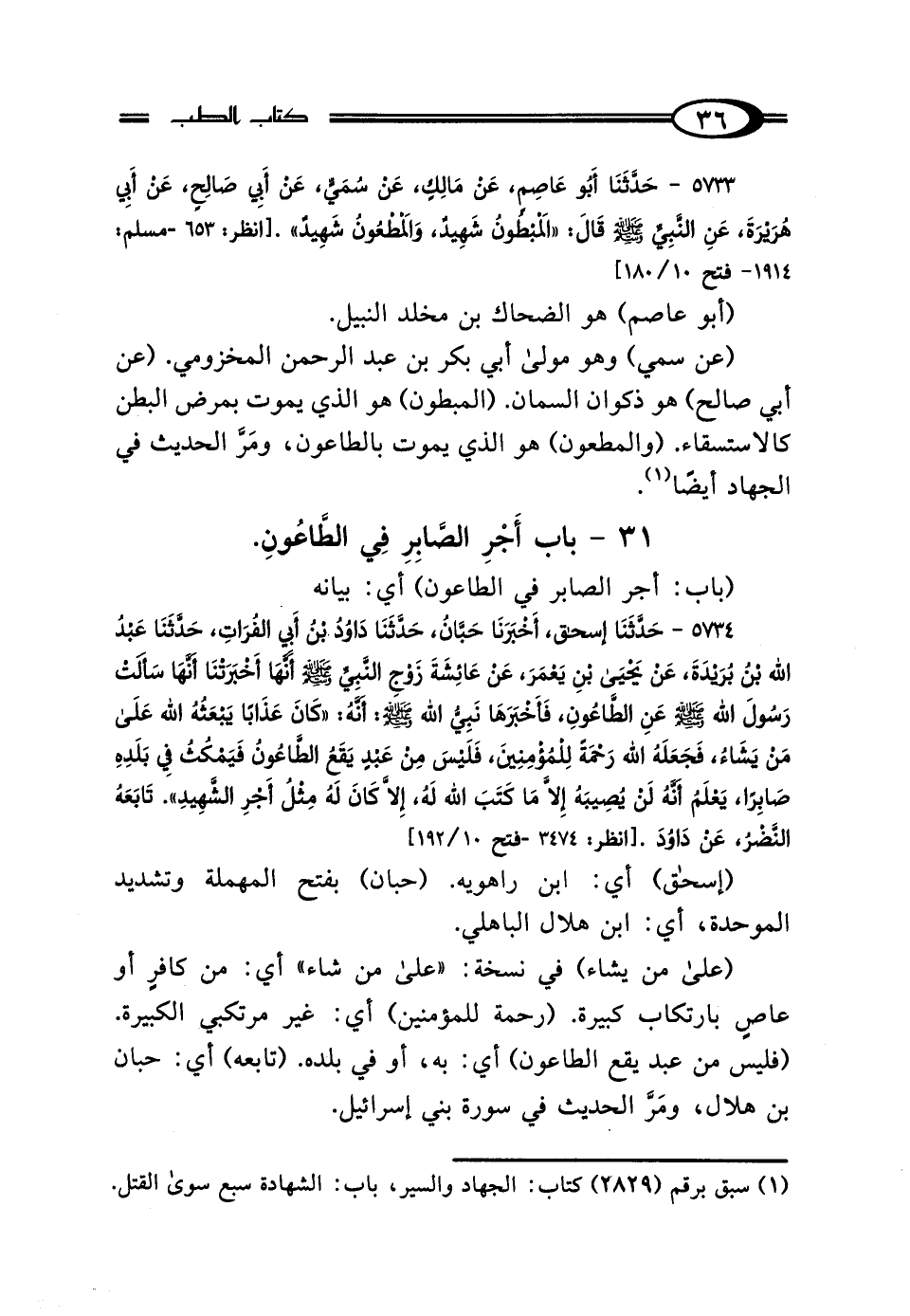 5733 - حَدَّثَنَا أَبُو عَاصِمٍ، عَنْ مَالِكٍ، عَنْ سُمَيٍّ، عَنْ أَبِي صَالِحٍ، عَنْ أَبِي هُرَيْرَةَ، عَنِ النَّبِيِّ صَلَّى اللهُ عَلَيْهِ وَسَلَّمَ قَال: "المَبْطُونُ شَهِيدٌ، وَالمَطْعُونُ شَهِيدٌ".