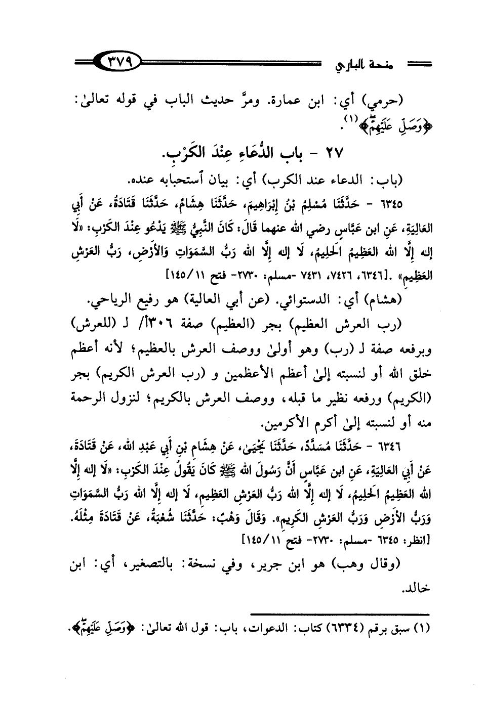 6346 - حَدَّثَنَا مُسَدَّدٌ، حَدَّثَنَا يَحْيَى، عَنْ هِشَامِ بْنِ أَبِي عَبْدِ اللَّهِ، عَنْ قَتَادَةَ، عَنْ أَبِي العَالِيَةِ، عَنِ ابْنِ عَبَّاسٍ: أَنَّ رَسُولَ اللَّهِ صَلَّى اللهُ عَلَيْهِ وَسَلَّمَ كَانَ يَقُولُ عِنْدَ الكَرْبِ: "لَا إِلَهَ إلا اللَّهُ العَظِيمُ الحَلِيمُ، لَا إِلَهَ إلا اللَّهُ رَبُّ العَرْشِ العَظِيمِ، لَا إِلَهَ إلا اللَّهُ رَبُّ السَّمَوَاتِ وَرَبُّ الأَرْضِ، وَرَبُّ العَرْشِ الكَرِيمِ" وَقَال وَهْبٌ: حَدَّثَنَا شُعْبَةُ، عَنْ قَتَادَةَ، مِثْلَهُ.